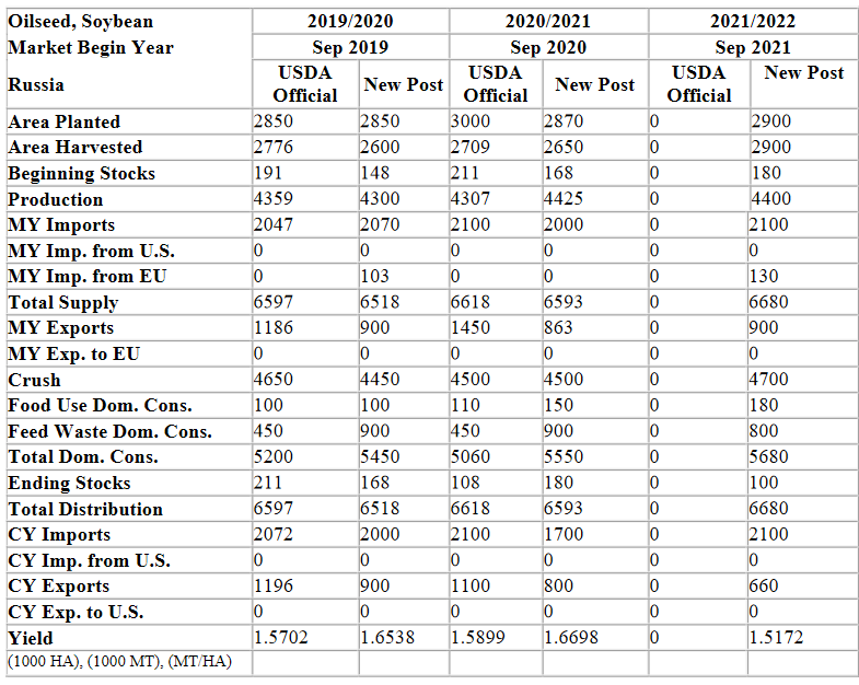 В стране увеличилось количество предприятий по переработке сои. В 2021/22 МГ производство сои, вероятно, достигнет 4,4 млн т, при условии, что погода и насекомые не будут представлять угрозы для урожая сои, как в 2020/21 МГ на Дальнем Востоке, когда значительный количество урожая было повреждено наводнениями. Рост производства объясняется увеличением посевных и убранных площадей в Дальневосточном и Центральном регионах страны. В отличие от подсолнечника, соя считается нишевой культурой, и в 2021/22 МГ их посевные и убранные площади, вероятно, вырастут сообщает oilworld.ru со ссылкой на USDA..