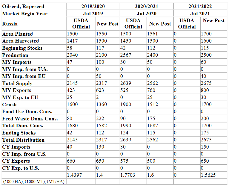 Осенью 2020 года Минсельхоз объявил о своей заинтересованности в расширении выращивания семян рапса наряду с соей в качестве прибыльных масличных культур. Частично благодаря поддержке Минсельхоза, производство рапса в 2020/21 МГ достигло рекордного уровня 2,4 млн т. Согласно прогнозам, эта тенденция сохранится в 2021/22 МГ, и ожидается, что посевные площади составят 1,7 млн га. FAS USDA Moscow прогнозирует, что благодаря расширению площадей производство рапса достигнет нового рекорда в 2,5 млн т в 2021/22 МГ. Учитывая восстановление спроса со стороны Китая и ожидаемый низкий урожай урожая в Европе, общий объем экспорта оценивается в 800 000 тонн.