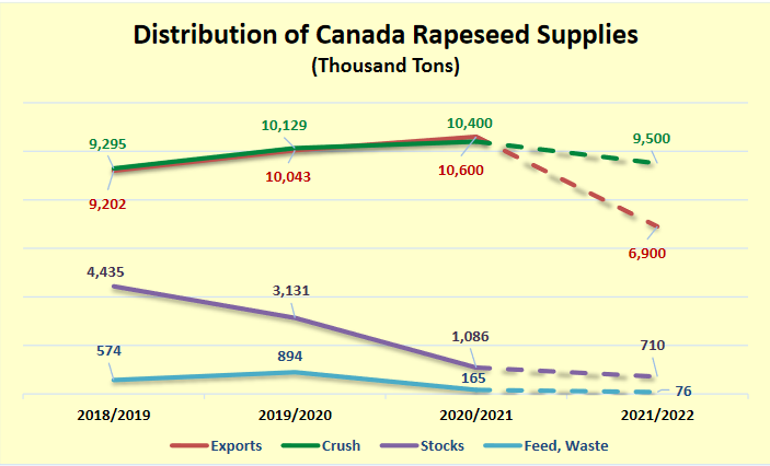 Поскольку начальные запасы уже находятся на минимальном уровне из-за высокого спроса, наблюдавшегося в последние несколько лет, большая часть снижения будет в отражена на экспорте семян. Ожидается также снижение переработки рапса; однако, учитывая сохраняющийся высокий спрос на шрот и масло из рапса в Соединенных Штатах и положительную маржу для канадских перерабатывающих заводов, ожидается, что влияние на объем дробления на внутреннем рынке будет менее значительным.