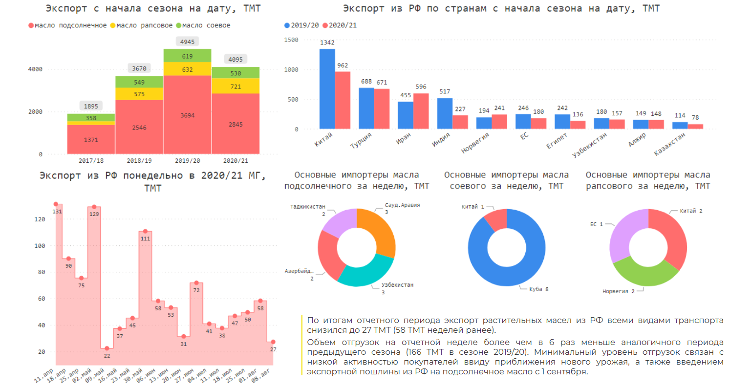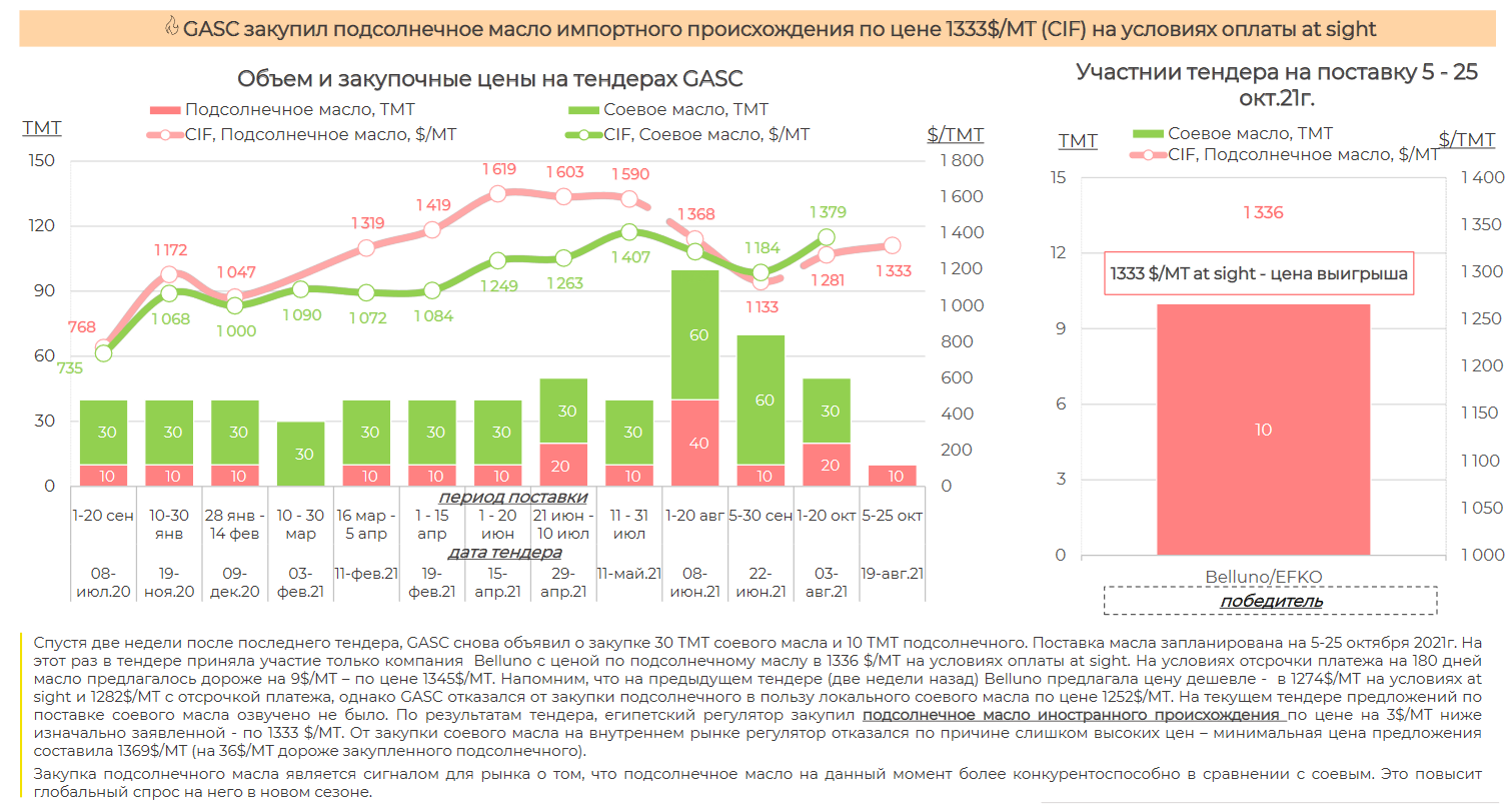 • GASC закупил подсолнечное масло импортного происхождения по цене 1333$/MT (C&F) на условиях оплаты at sight. Спустя две недели с последнего тендера, GASC снова объявил о закупке 30 ТМТ соевого масла и 10 ТМТ подсолнечного. Поставка масла запланирована на 5-25 октября 2021г. По результатам тендера, регулятор закупил подсолнечное масло иностранного происхождения по 1333 $/MT. От закупки соевого масла на внутреннем рынке регулятор отказался по причине слишком высоких цен – минимальная цена на соевое масло была предложена на уровне 1369$/MT. Закупка подсолнечного масла является сигналом для рынка о том, что подсолнечное масло на данный момент более конкурентоспособно в сравнении с соевым. Это повысит глобальный спрос на него в новом сезоне.