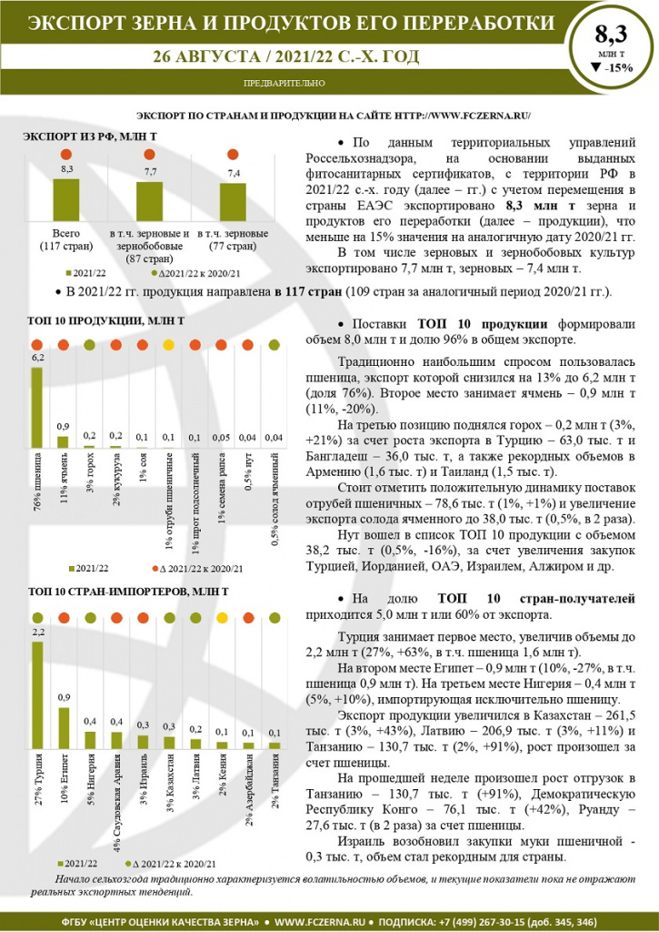 Анализ экспорта зерна и продуктов его переработки за 2021/22 с.-х. год на 19.08 (предварительно)
