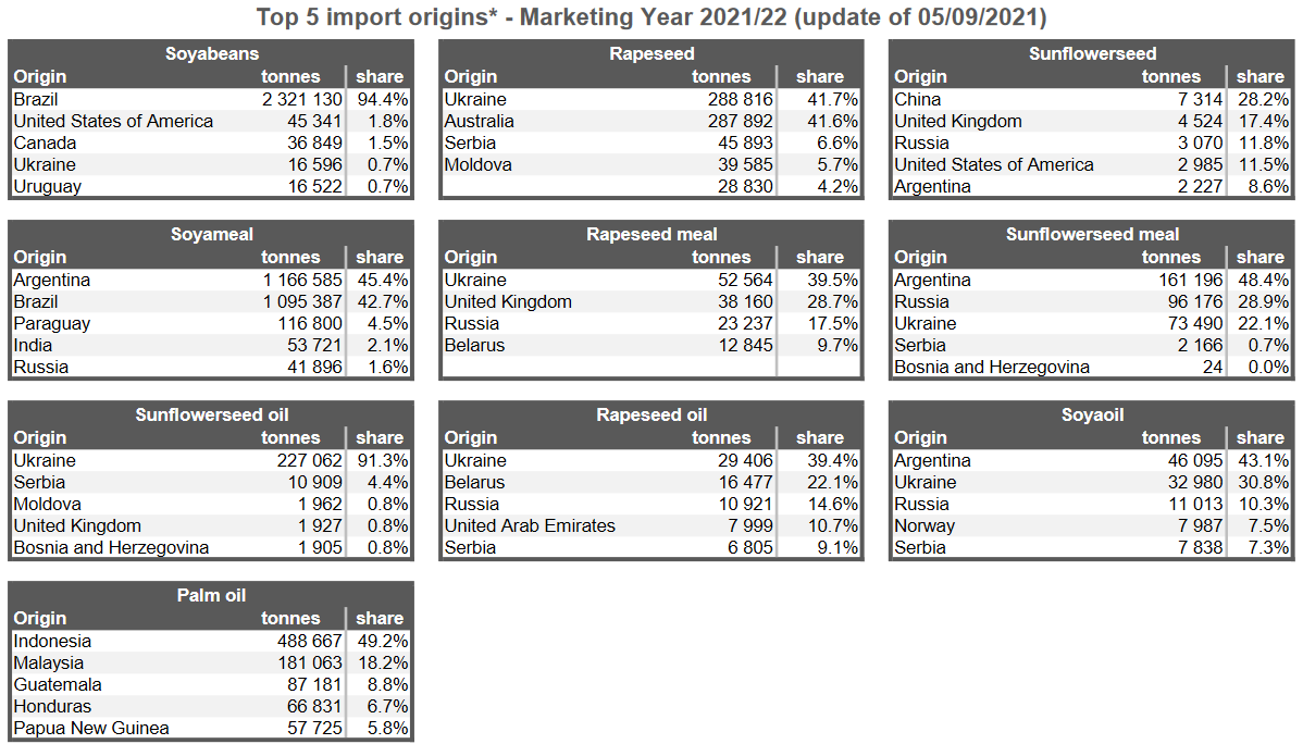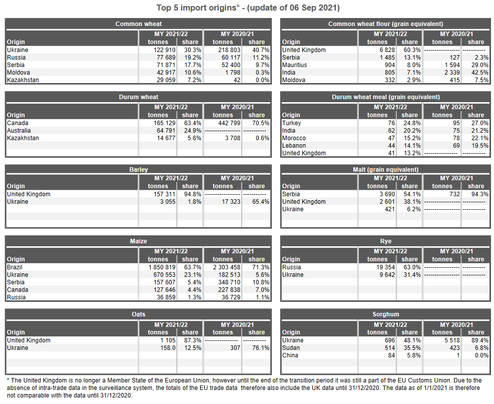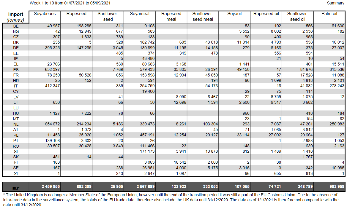 ЕС. Импорт - экспорт зерновых, масличных, растительного масла, шрота. Оперативные данные на 05.09.2021