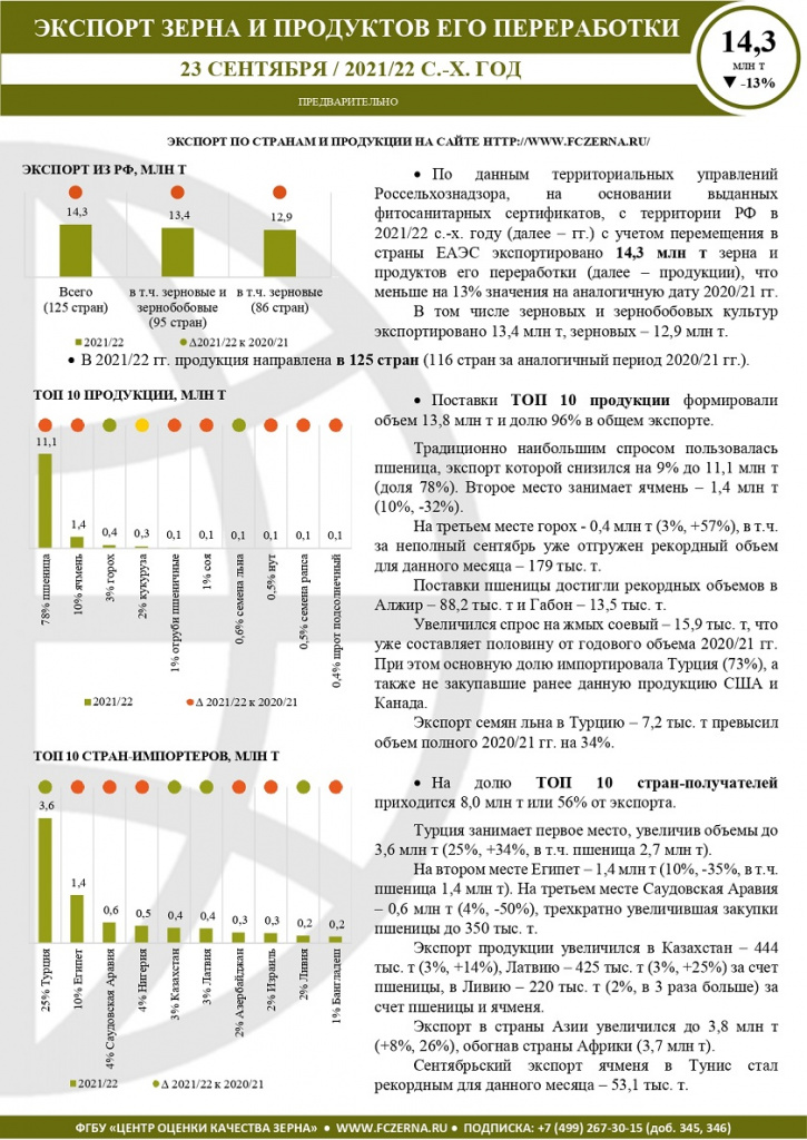 Анализ экспорта зерна и продуктов его переработки за 2021/22 с.-х. год на 09.09 (предварительно)