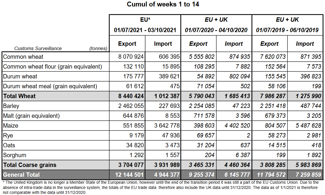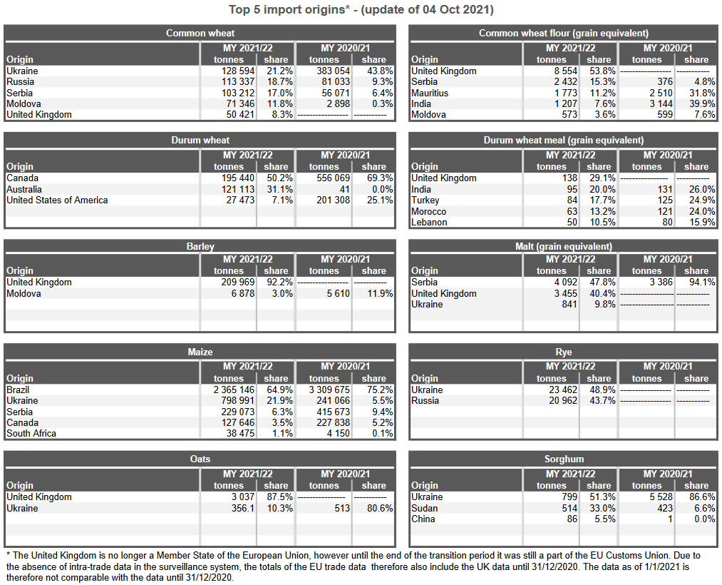 ЕС. Импорт - экспорт зерновых, масличных, растительного масла, шрота. Оперативные данные на 03.10.2021