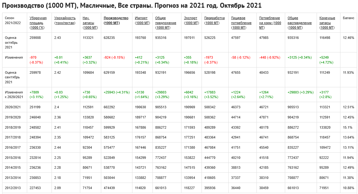 Мировое производство масличных культур 2021/22 немного снизилось в этом месяце на снижении прогнозов по аргентинской сое, и семенам подсолнечника и канадского рапса что более чем компенсируют более высокие урожаи сои в США и Пакистанские хлопковые культуры. Глобальное сокращение в основном обусловлено этими тремя более мелкими культурами.