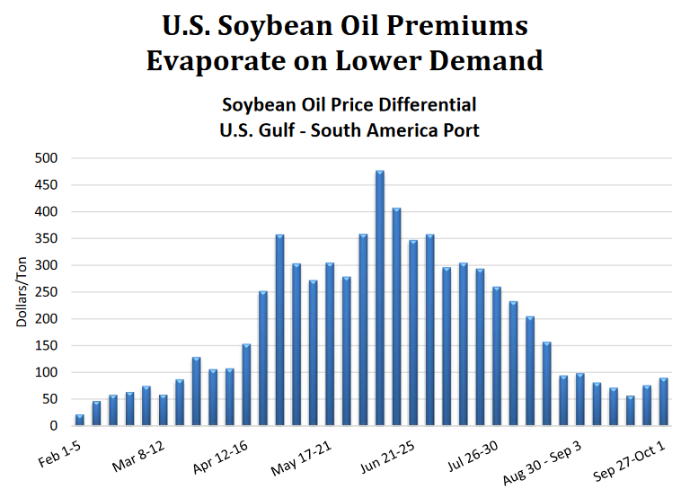 Цены на соевое масло в портах США достигали максимума почти в 500 долларов за тонну выше котировок южноамериканских портов в середине июня, но резко упали в июле и августе. Однако в последние недели премии снова выросли, и в настоящее время они около 90 долларов за тонну. Хотя это значительно выше предыдущего 4-летнего среднего показателя в 12 долларов за тонну, это приближает премию к уровням, наблюдавшимся в марте сообщает oilworld.ru со ссылкой на USDA.