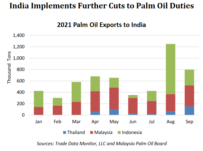 В результате, ожидается, что импорт пальмового масла в Индию в 2020/21 году увеличится на 470 000 тонн до 8,5 миллиона, прогноз импорта на 2021/22 год - повышен на 300 000 тонн до 8,6 млн. Некоторые мировые поставщики пальмового масла уже увеличение экспорт в Индию. После первой волны снижения тарифов импорт пальмового масла в августе и сентябре более чем удвоился по сравнению со среднемесячным показателем за январь-июль 2021 года. Индонезия, крупнейший поставщик пальмового масла в Индию, стала основным бенефициаром увеличения спроса сообщает oilworld.ru со ссылкой на USDA. Индонезийские экспортеры увеличили поставки в преддверии собственного сентябрьского повышения экспортной пошлины на сырое пальмовое масло. Экспорт пальмового масла из Малайзии и Таиланда в Индию также заметно вырос в августе и сентябре.