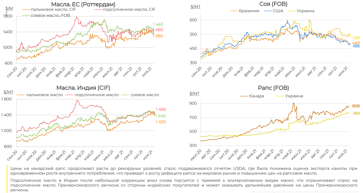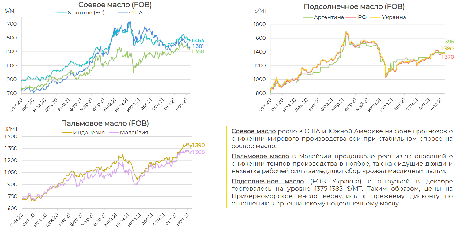 • Мировые цены предложения на подсолнечное масло (FOB Черное море) с поставкой в декабре озвучивались на уровне 1365-1375 $/МТ. Рынок отреагировал на очередное повышение прогноза Минсельхоза США по мировому производству подсолнечника в сезоне 2021/22 до 56 ММТ (+0,15 ММТ). Однако снижение ограничивается увеличившейся вывозной пошлиной на масло в РФ на декабрь (276,7$/МТ), что приведет к уменьшению объема экспортных отгрузок в будущем месяце.