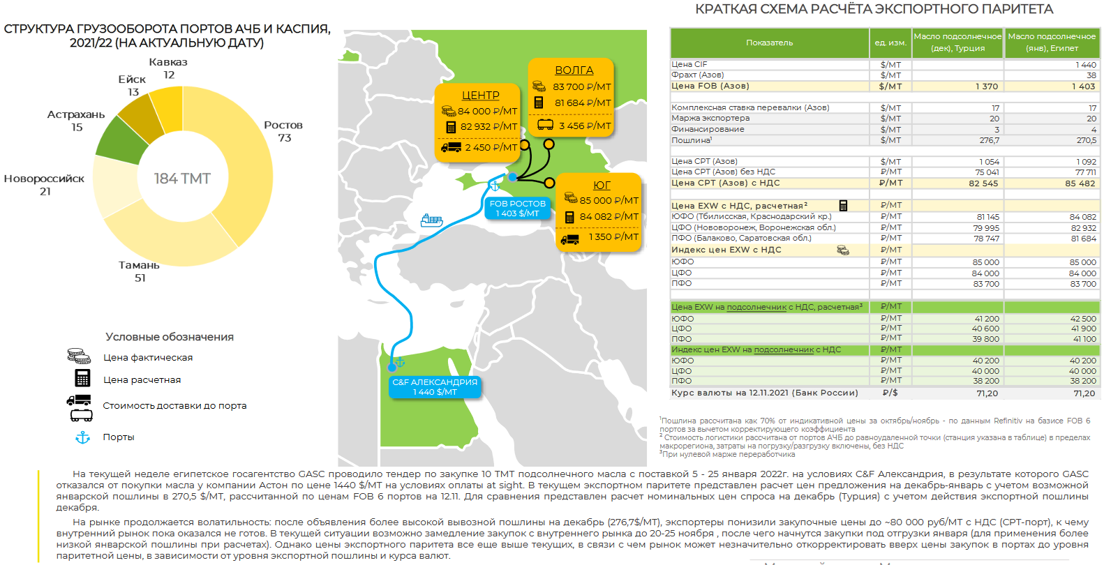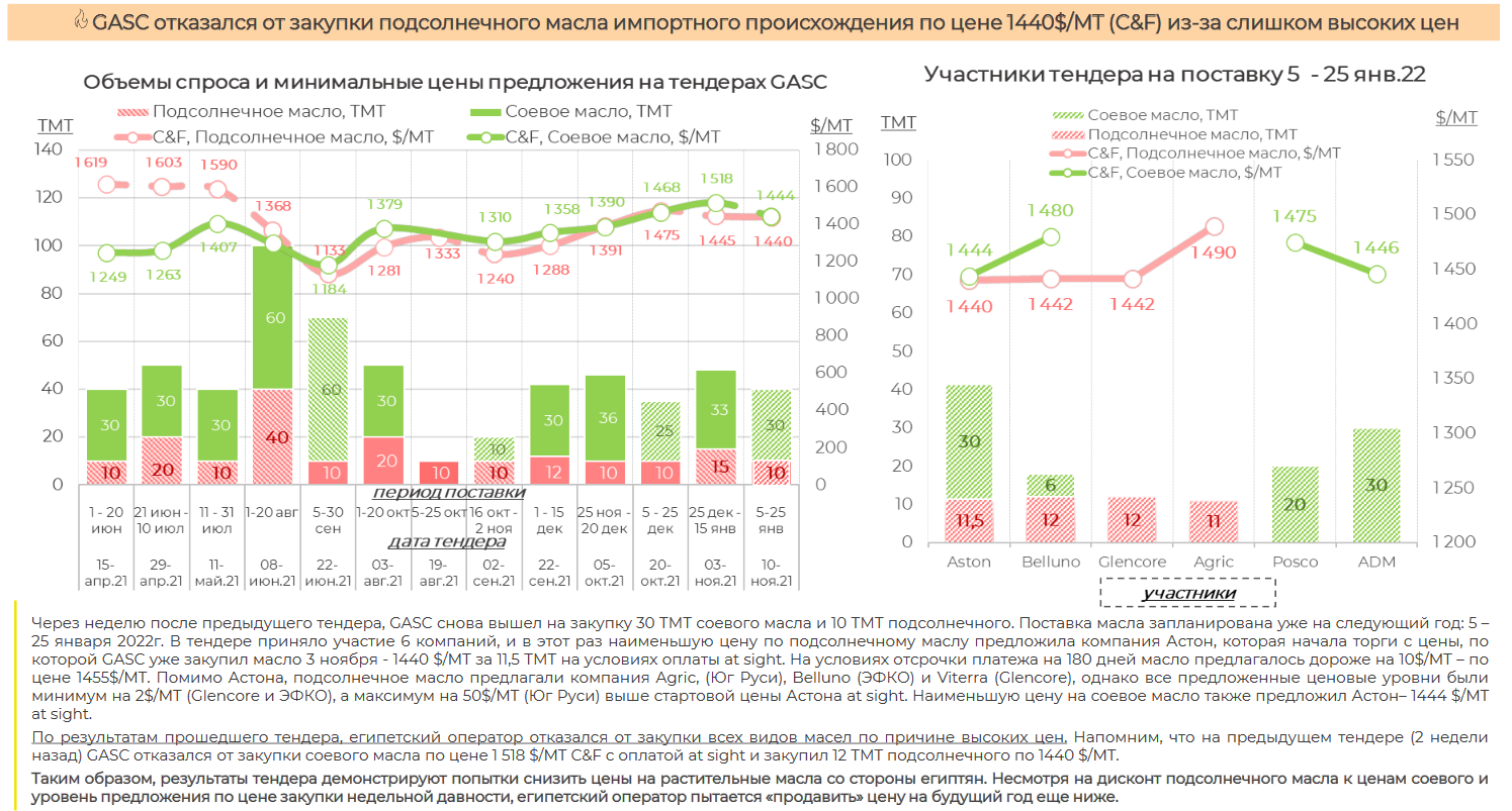 • GASC отказался от закупки подсолнечного масла импортного происхождения по цене 1440$/MT (C&F) на условиях оплаты at sight. Спустя неделю после предыдущего тендера, GASC снова анонсировал тендер о закупке 30 ТМТ соевого масла и 10 ТМТ подсолнечного с поставкой в период 5 – 25 января 2022г. По результатам тендера, государственное агентство Египта отказалось от закупки всех видов масел по причине высоких цен. Наименьшая цена предложения по подсолнечному маслу была озвучена на уровне 1440$/MT, на соевое 1444 $/MT (C&F). Напомним, что на предыдущем тендере 03.11