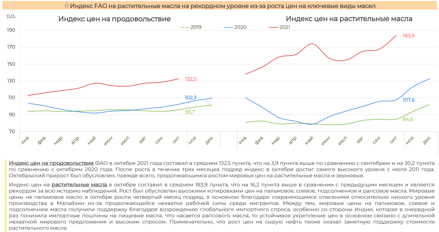 • MPOB: производство пальмового масла в Малайзии выросло в октябре на 1,3 % в сравнении с сентябрем – до 1,7 ММТ. Таким образом, производство пальмы находится на уровне 2020г. (1,7 ММТ), однако все еще на 4% меньше уровня аналогичного периода 2019 г. (1,8 ММТ). В том числе по оценкам MPOB запасы в Малайзии выросли на 4,4% в месячном исчислении (до 1,8 ММТ) в октябре , что однако, по-прежнему на 16,8% ниже 10-летнего исторического среднего показателя за октябрь в 2,2 ММТ.