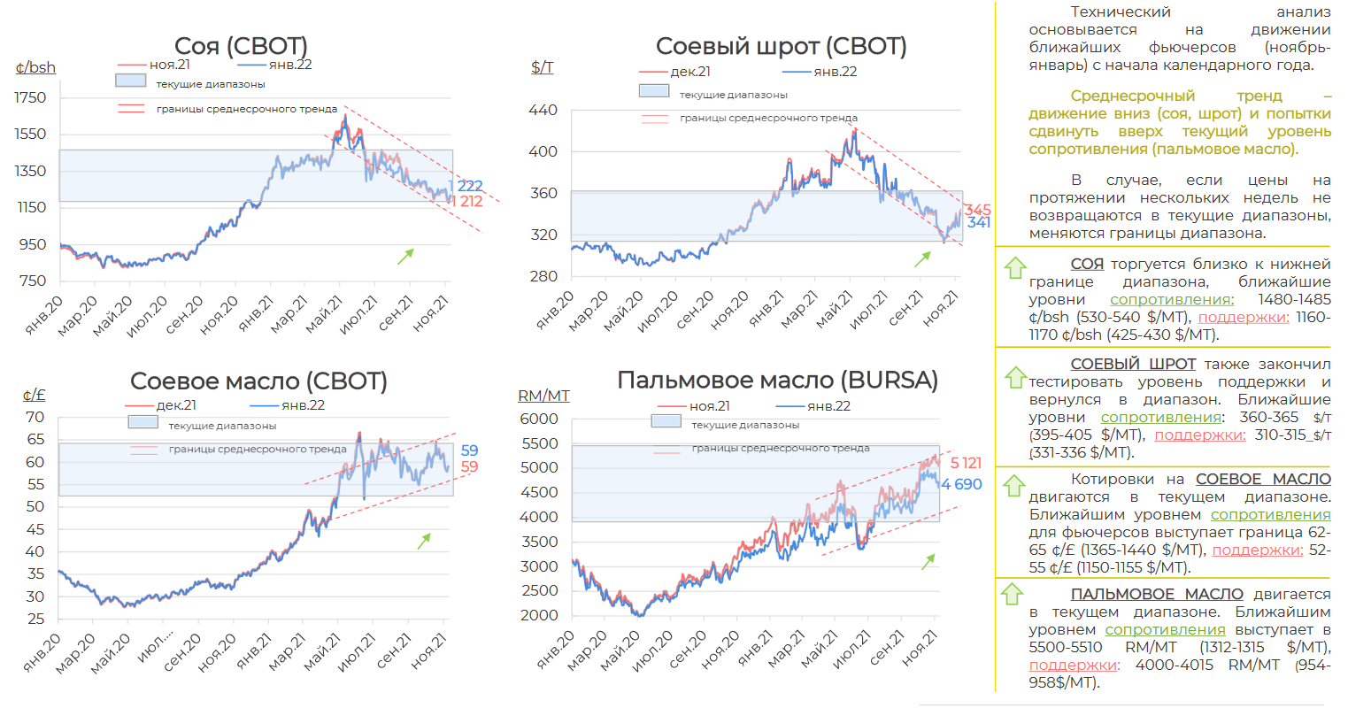 • Цены на соевые бобы на СВОТ укрепились на 7$/MT до 445 $/МТ на фоне снижения оценок USDA мирового производства сои в 2021/22. В ноябрьском отчете Минсельхоз США уменьшил свой прогноз мирового предложения сои на 1,1 ММТ, скорректировав вниз оценки производства в Аргентине и США на 1,5 и 0,6 ММТ соответственно. Увеличение прогноза производства сои в Индии не смоглокомпенсироватьсовокупноеснижение.