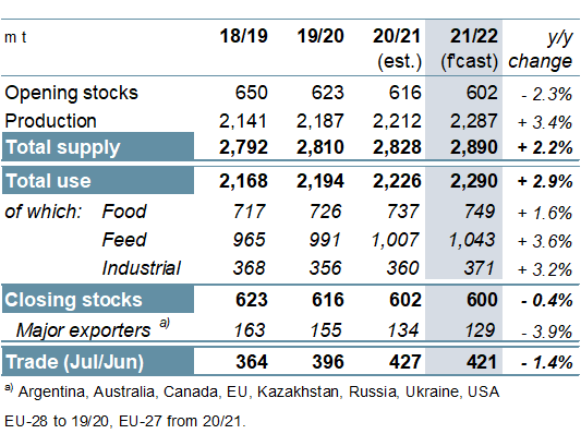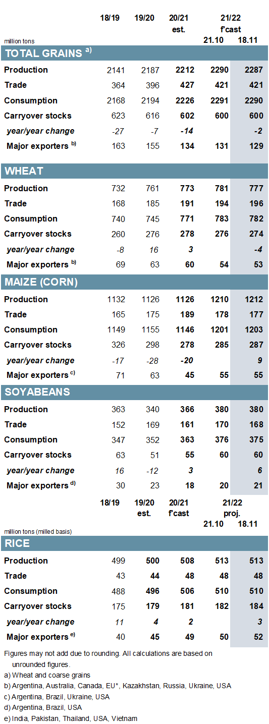 По прогнозам, мировое производство зерна (пшеницы и грубого зерна) в 2021/22 году вырастет на 76 млн тонн в год до рекордных 2287 млн тонн, включая новые пики для кукурузы и пшеницы. Благодаря более высокому использованию кукурузы в кормах и промышленности (как на рекордных уровнях), так и более широкому использованию пшеницы в пищевых продуктах (также рекордному), потребление зерна, по прогнозам, вырастет на 3 %. Мировые запасы, как ожидается, упадут до шестилетнего минимума в 600 млн тонн (- 2 млн тонн в год). В то время как ожидается, что глобальный переход пшеницы будет лишь незначительно ниже рекордного максимума предыдущего года, запасы пшеницы у основных экспортеров могут оказаться на девятилетнем минимуме. Объем торговли (июль/июнь) снизился на 1 % в годовом исчислении, включая более высокие поставки пшеницы и сорго, но снизился для кукурузы, ячменя и овса.