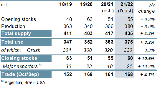 Основываясь на значительном урожае в США, ожидания рекордного мирового урожая сои в 2021/22 году, который составит 380 млн тонн (+4% г/г), также обусловлены более крупными или рекордными урожаями в Южной Америке, где посевы сейчас идут полным ходом. В связи с ростом спроса в Азии, рост спроса на соевые продукты, как ожидается, приведет к увеличению общего использования до нового пика. Совокупные запасы могут увеличиваться второй год подряд, в том числе у крупнейших экспортеров, возглавляемых США. По прогнозам, товарооборот вырастет на 5% в годовом исчислении, в первую очередь за счет более крупных поставок в Азию. В связи с сокращением поставок из США ожидается, что южноамериканские экспортеры увеличат свою долю в мировом объеме.