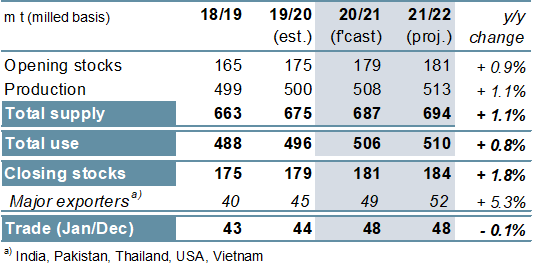 Более высокий спрос со стороны импортеров в Азии и Африке, как ожидается, приведет к увеличению мировой торговли рисом до пика в 48,3 млн тонн (44,0 млн тонн) в 2021 году. В связи с очередным рекордным ростом в Индии прогнозируется, что мировое производство в 2021/22 году достигнет нового максимума, в то время как запасы, как ожидается, увеличатся по мере накопления у основных экспортеров. Несмотря на вероятное сокращение потребления кормов в Китае, потребление прогнозируется на рекордном уровне при продолжающемся росте населения. Прогнозируется, что в 2022 году объем торговли практически не изменится в годовом исчислении, поскольку потенциальному сокращению поставок в Азию противостоит более устойчивый спрос в Африке.