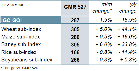 Индекс IGC по зерновым и масличным культурам (GOI) вырос на 1 % м/м, так как более низкие цены на сою и рис были компенсированы чистым ростом цен на пшеницу, кукурузу и ячмень.