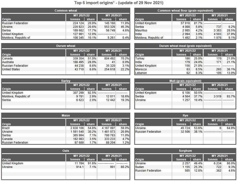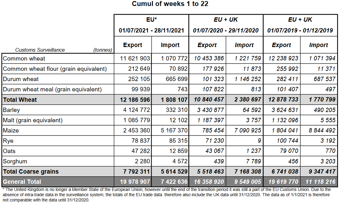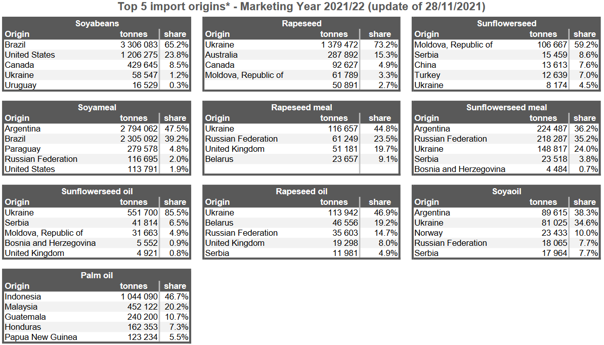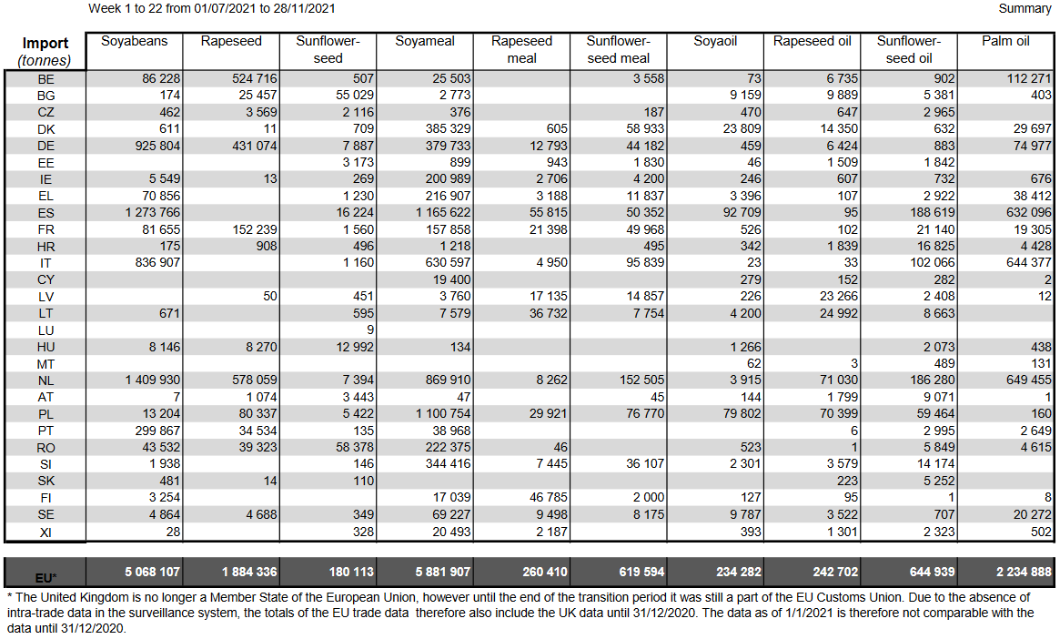 25.11.21 ЕС. Импорт - экспорт зерновых, масличных, растительного масла, шрота. Оперативные данные на 21.11.2021