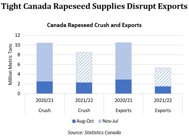 Согласно данным Статистического управления Канады, темпы производства рапсового масла значительно снизятся в 2021/22 году, поскольку высокие температуры, наблюдаемые во время развития семян, привели к снижению содержания масла в культуре. В целом, производство рапсового масла в Канаде, по прогнозам, снизится на 1,0 млн тонн по сравнению с прошлым годом, а экспорт сократится почти на 600 000 тонн.