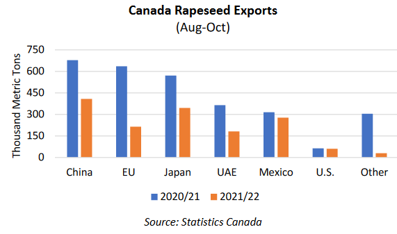 Падение экспорта семян рапса из Канады за первые 3 месяца 2021/22 года затронуло все его основные направления. Экспорт в ЕС сократился почти на две трети, в ОАЭ произошел 50-процентный спад, а в Китай и Японию - 40-процентный спад. Рынки в Северной Америке испытали более умеренное снижение: Мексика снизилась на 12 процентов, а Соединенные Штаты - всего на 4 процента.