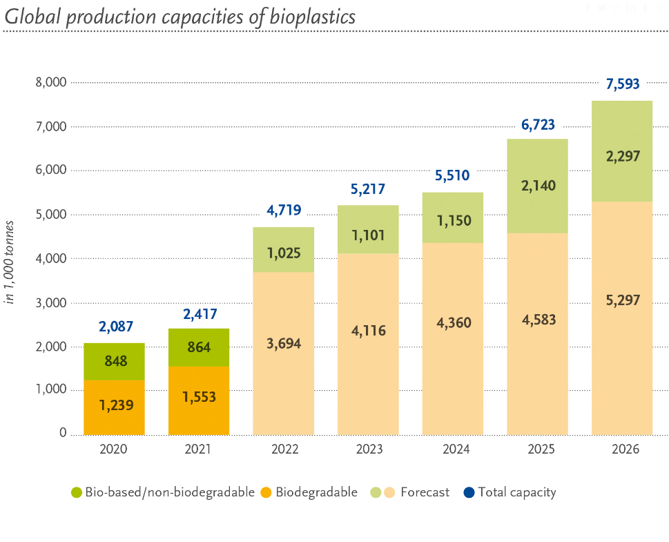 «До 2026 года доля биопластиков в общем мировом производстве пластмасс впервые превысит отметку в 2%».