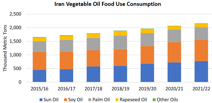 В 2021/22 году потребление масла из семян подсолнечника в Иране прогнозируется в рекордном объеме - 775 000 тонн, а рекордная доля от общего потребления растительного масла составит 36 процентов. Доля подсолнечного масла в общем объеме потребления масла в Иране увеличивалась 10 из последних 11 лет. Если эта тенденция сохранится, подсолнечное масло затмит соевое масло как наиболее потребляемое пищевое масло в Иране в течение 2 лет сообщает oilworld.ru со ссылкой на USDA..