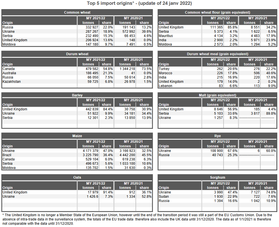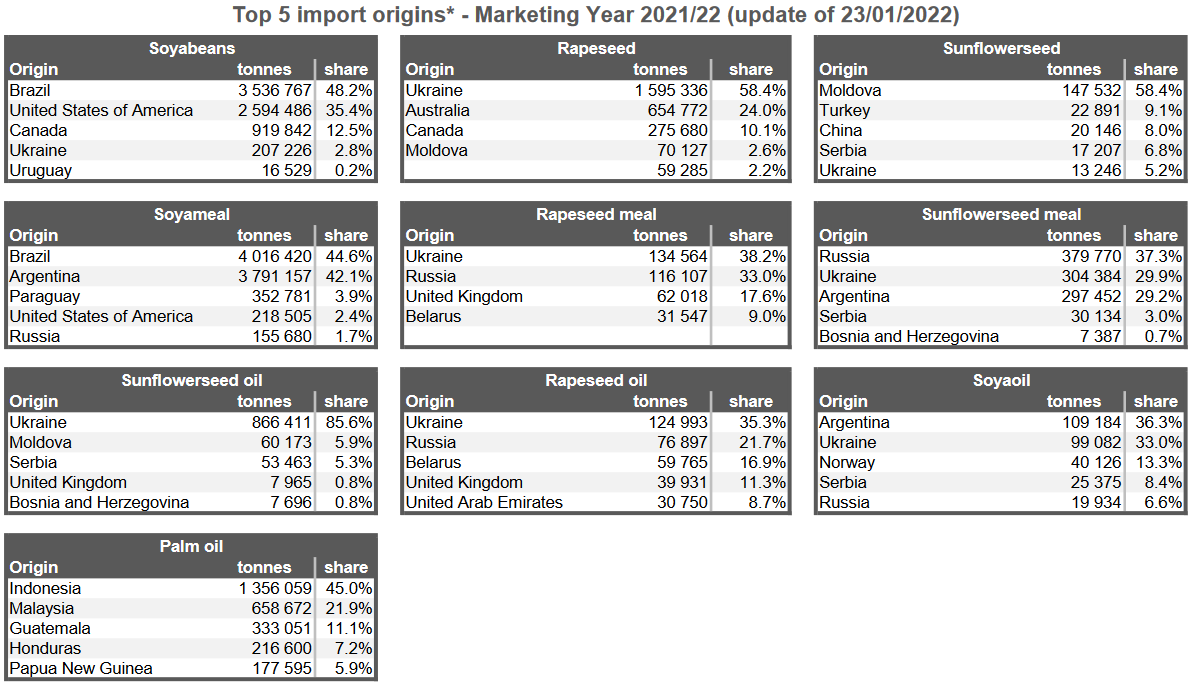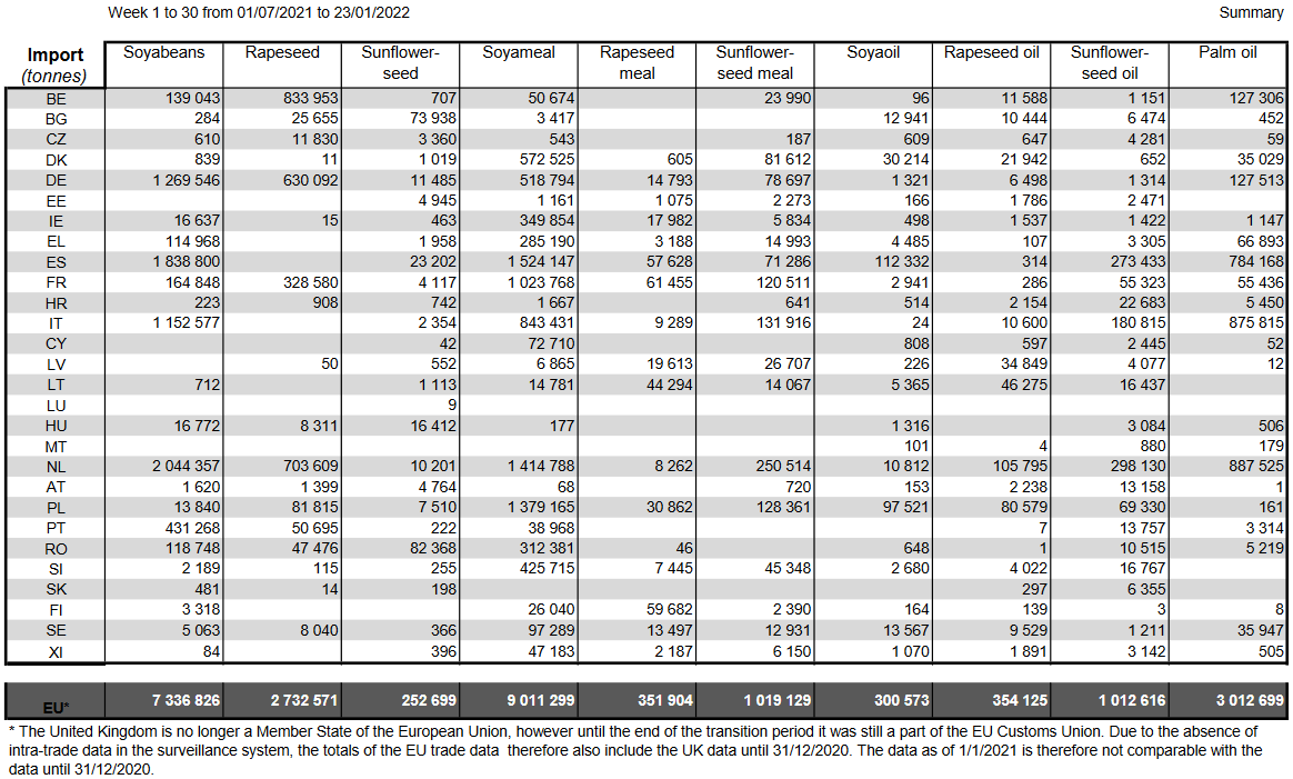 ЕС. Импорт - экспорт зерновых, масличных, растительного масла, шрота. Оперативные данные на 23.01.2022