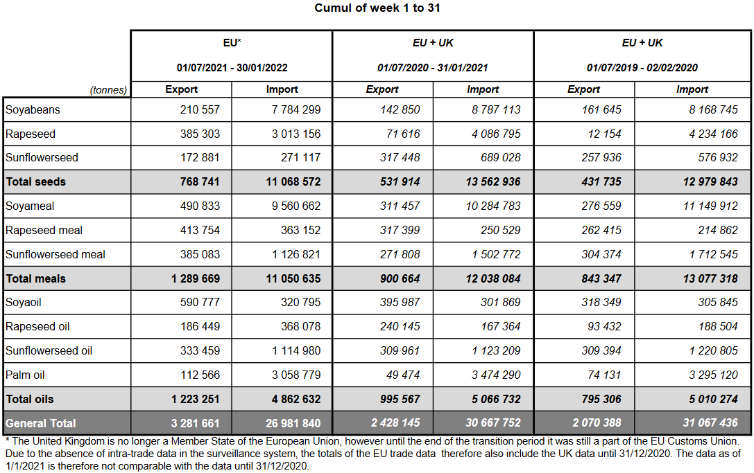ЕС. Импорт - экспорт зерновых, масличных, растительного масла, шрота. Оперативные данные на 30.01.2022