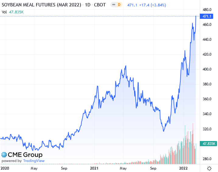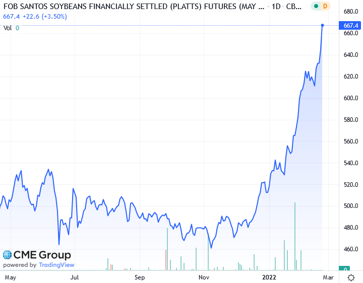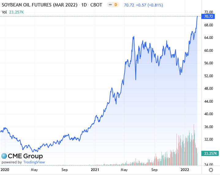 Фьючерсы на соевое масло на Чикагской товарной бирже выросли примерно на 3% 22 февраля, при этом майские контракты закрылись выше 70 центов за фунт из-за резкого роста энергетических рынков, а также из-за усиливающихся опасений по поводу нехватки урожая сои в Аргентине. из-за плохой погоды.