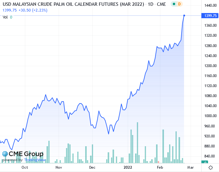 23 февраля мартовские фьючерсы на пальмовое масло на Малазийской товарной бирже впервые пересекли уровень 6000 MR/т (1433,52 доллара США) на фоне роста цен на энергоносители, проблем с поставками растительного масла и резкого ночного ралли на соевое масло CBOT сообщает oilworld.ru со ссылкой на S&P Global Platts.
