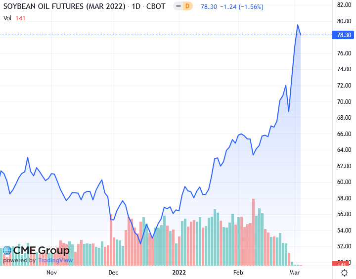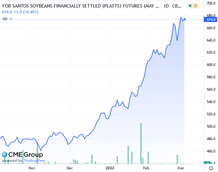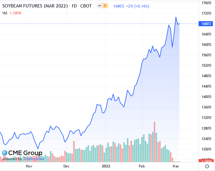 Фьючерсы на сою на Чикагской товарной бирже закрылись разнонаправленно в четверг, так как рынок вырос из-за высокого спроса, но позже отступил, поскольку трейдеры зафиксировали прибыль, а цены колебались вблизи недавних многолетних максимумов сообщает Рейтер. Рынок остается крайне волатильным на фоне неопределенности относительно того, как долго конфликт в Украине повлияет на экспорт пищевого масла из региона Черного моря.