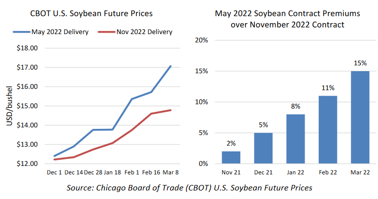 В связи со снижением производства сои в Южной Америке и неопределенностью относительно перспектив экспорта подсолнечной продукции из Черноморского региона цены на сою в последние месяцы резко выросли. Майский контракт на CBOT вырос на 38 процентов с начала декабря, или почти 4,70 доллара за бушель, до 17,07 доллара 8 марта. Ноябрьский контракт на соевые бобы нового урожая вырос более скромными темпами (на 21 процент), добавив к контракту почти 2,60 доллара за бушель к цене с начала декабря. В Соединенных Штатах это привело к увеличению премии за соевые бобы старого урожая по сравнению с новым урожаем. Премии, которые в ноябре 2021 года составляли около 2 процентов, в настоящее время составляют 15 процентов (в начале марта).Более высокие цены и растущие премии, стимулируют продавать сейчас, а не удерживать запасы до урожая 2022 года в США. Однако это также препятствует краткосрочным покупкам со стороны покупателей, которые могут позволить себе подождать до конца года. Данные по экспортным продажам из США, говорят о увеличившихся продажах соевых бобов нового урожая, особенно в Китай. Кроме того, ожидается, что Китай увеличит продажи запасов, что компенсирует некоторые краткосрочные продажи из Бразилии в ближайшие месяцы сообщает oilworld.ru со ссылкой на USDA.