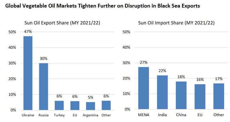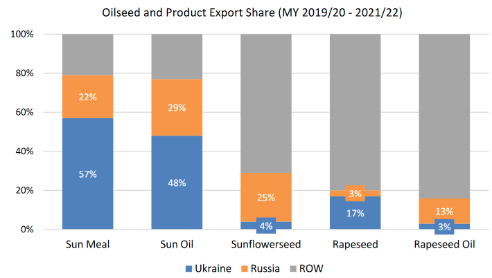 Конфликт в Черноморском регионе привел к прекращению и снижению экспорта подсолнечного масла как из Украины, так и из России. В совокупности на регион приходится примерно 80 процентов мирового экспорта подсолнечного масла. На подсолнечное масло приходится всего 12 процентов мирового потребления пищевых масел и 9 процентов от общего потребления растительных масел (включая биотопливо и другие виды промышленного использования). Его доля в мировой торговле растительным маслом аналогична соевому маслу и составляет 14 процентов мировой торговли.
