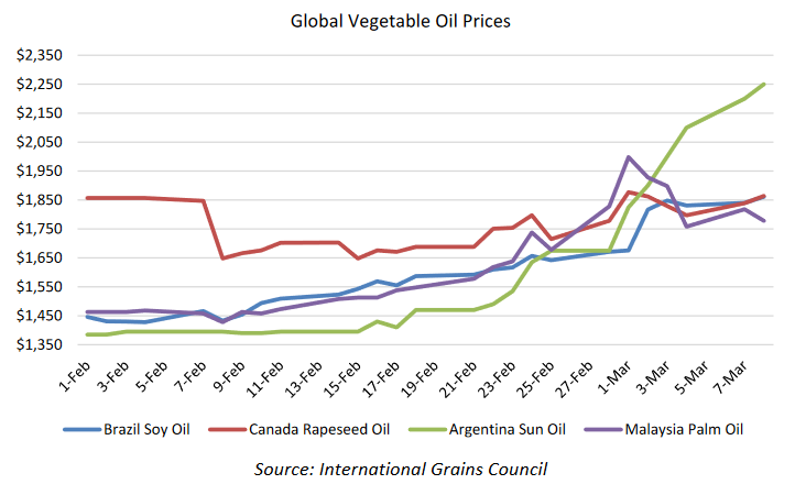 Растущая нехватка поставок растительного масла очевидна в динамике цен за последние 5 недель. Засуха в Канаде в прошлом году удерживала канадский рапс на высоком уровне в течение последних 6 месяцев, в то время как дефицит производства сои в Южной Америке способствовал росту цен на сою и пальмовое масло в феврале. Цены на подсолнечное масло растут с тех пор, как в конце февраля ситуация в Черноморском регионе ухудшилась. Например, цены на подсолнечное масло в Аргентине резко выросли и достиг 2250 долларов за тонну по состоянию на 8 марта. В начале февраля подсолнечное масло имело хорошие возможности для увеличения своей доли в мировой торговле и потреблении на фоне высоких премий за конкурирующие масла, но сейчас оно дороже и менее доступно, чем заменители.
