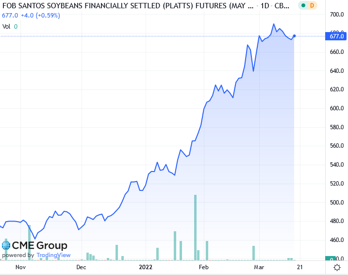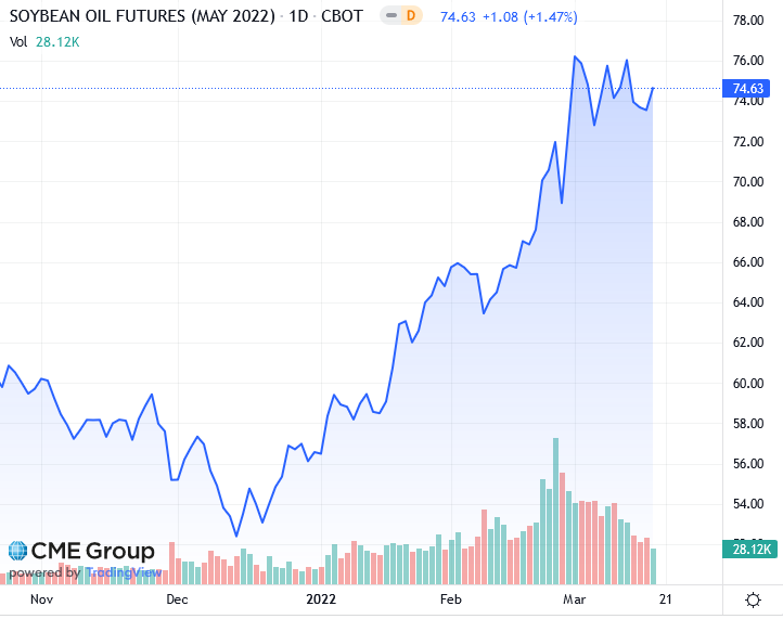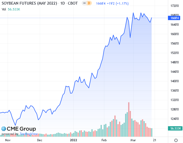 Соевые бобы CBOT укрепились, хотя самый активный майский контракт остался в торговом диапазоне среды. Соевые бобы получили поддержку от соевого масла и роста фьючерсов на сырую нефть в США выше 100 долларов за баррель. Соевое масло иногда следует за нефтью из-за его роли в качестве сырья для биодизельного топлива.