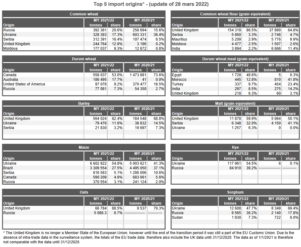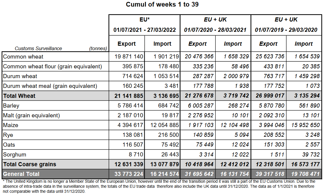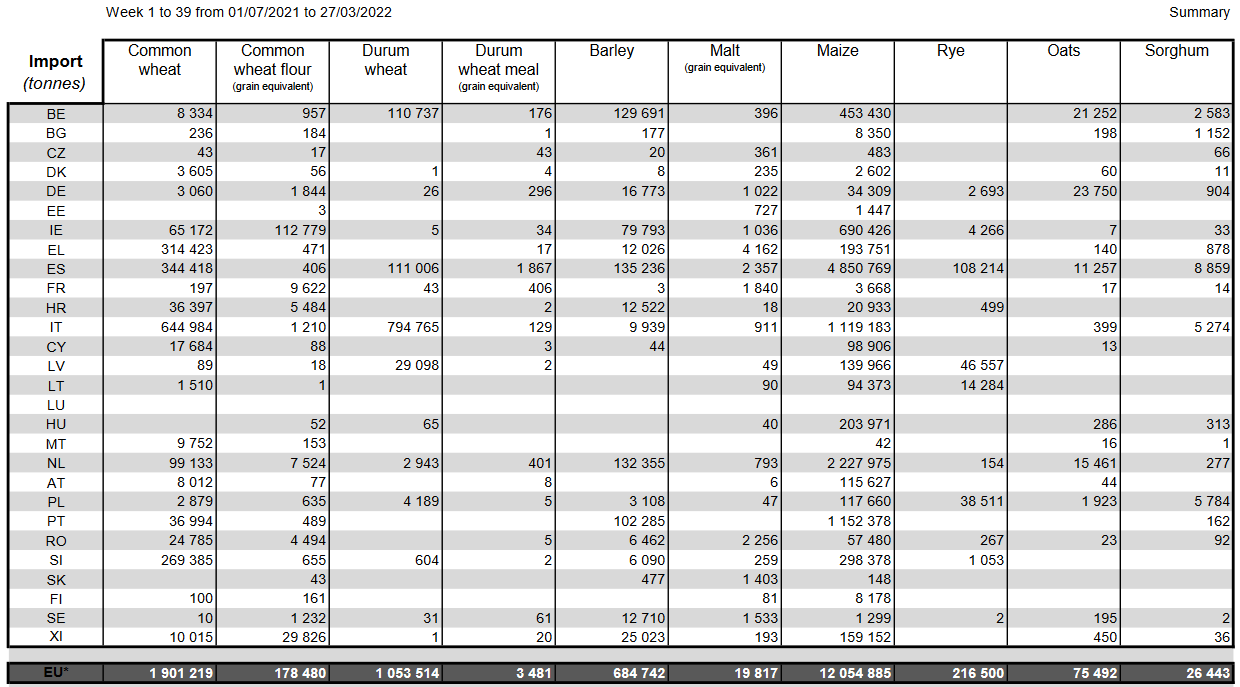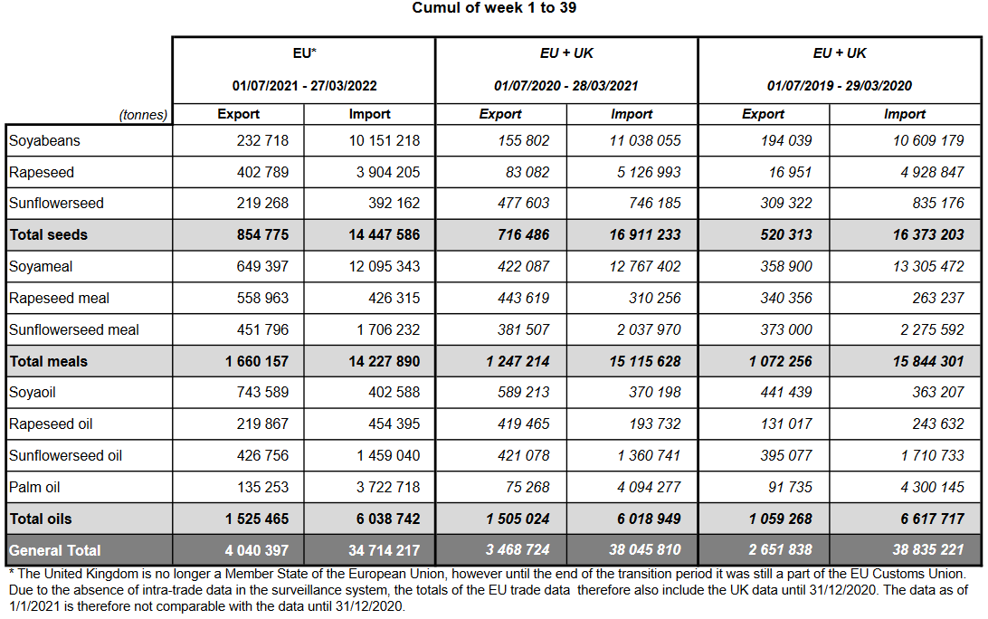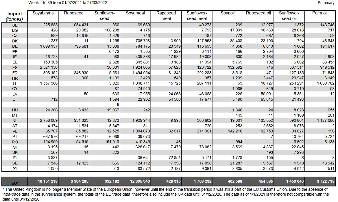 16.03.22 ЕС. Импорт - экспорт зерновых, масличных, растительного масла, шрота. Оперативные данные на 13.03.2022