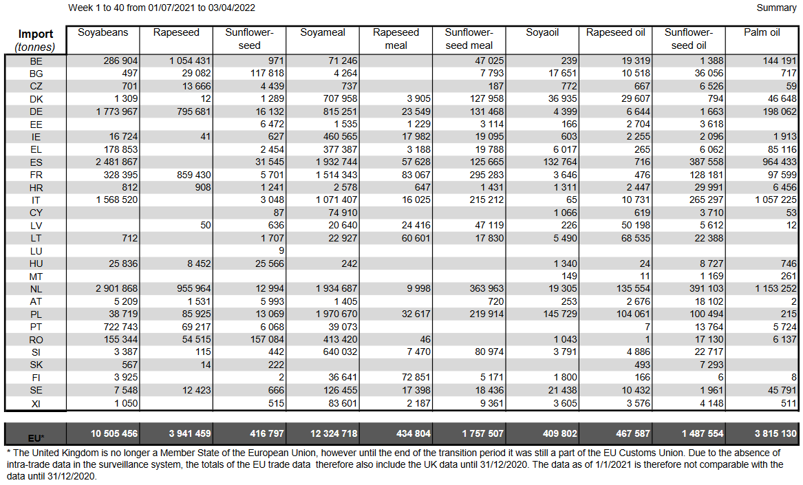 ЕС. Импорт - экспорт зерновых, масличных, растительного масла, шрота. Оперативные данные на 13.03.2022
