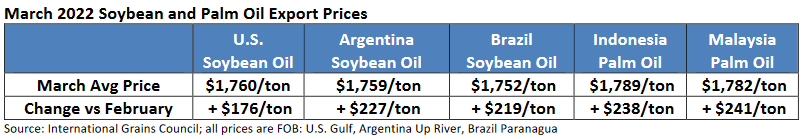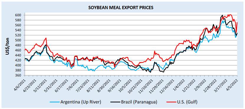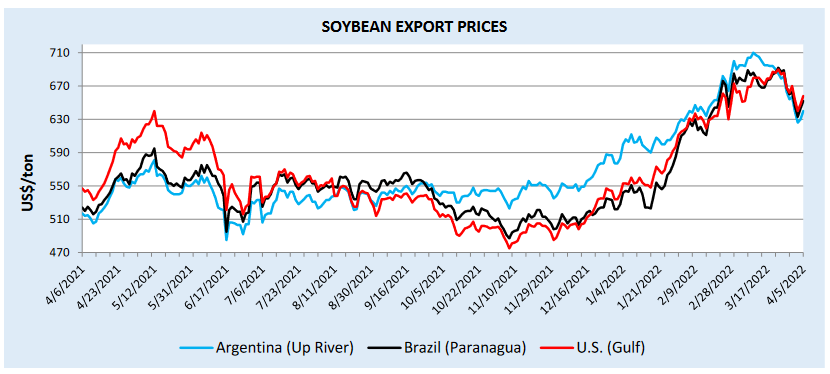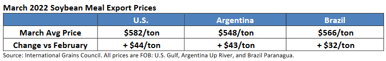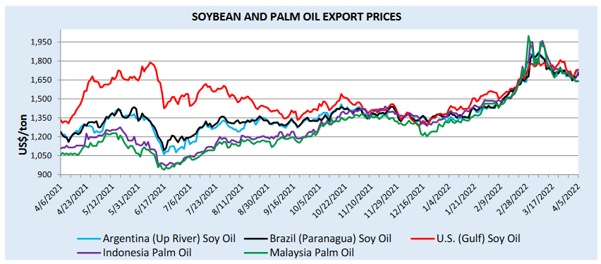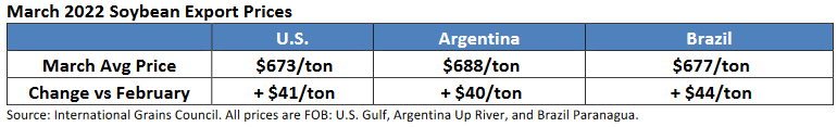 Цены на сою выросли в марте, при этом среднемесячные цены достигли многолетних максимумов в Соединенных Штатах, Аргентине и Бразилии. Затяжные последствия засухи в Южной Америке плюс события в Черноморском регионе были основными факторами. Цены достигли пика в середине марта и снизились, поскольку рынки приспособились к ослаблению спроса из-за более высоких цен и замедления производства в Китае.
