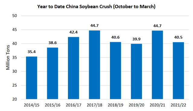 В первом полугодии переработка сои в Китае замедлилась до уровней, невиданных со времен вспышек африканской чумы свиней (АЧС) в 2018/19 и 2019/20 годах. В течение первой половины 2021/22 года резкий рост цен на корма и низкие цены на мясо привели к снижению уровня переработки сои сообщает oilworld.ru со ссылкой USDA.
