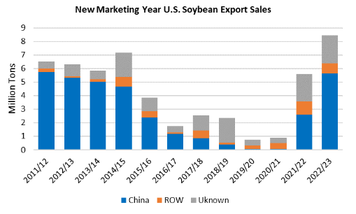 Экспортные продажи сои из США резко возрастут в следующем маркетинговом году. Экспортные продажи сои в США в следующем маркетинговом году (2022/23 МГ) находятся на 11-летнем максимуме по состоянию на 31 марта 2022 года. Китай доминирует в продажах сои в США в 2022/23 году, составив почти 70 процентов от общего объема продаж нового урожая.