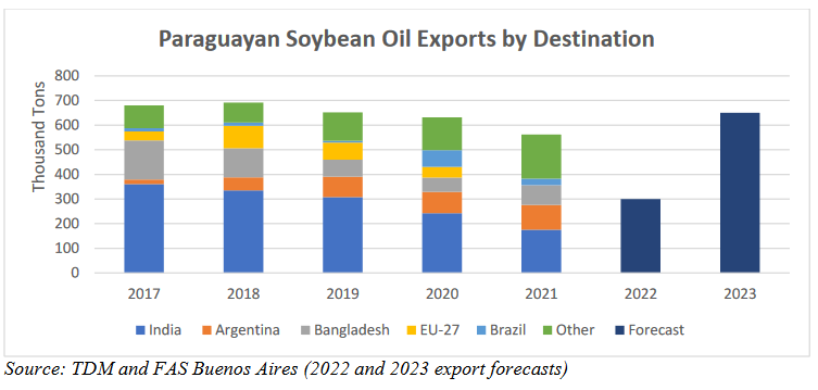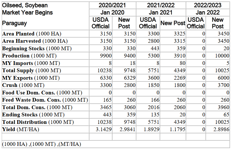 Ожидается, что в сезоне 2022/2023 производство сои в Парагвае может составить 10 миллионов тонн (MMT) с 3,45 миллиона гектаров. Экспорт в 2022/23 МГ прогнозируется на уровне 6 млн тонн. В 2021/2022 МГ из-за продолжительной сухой и жаркой погоды урожайность сои существенно снизилась до исторического минимума, а конечное производство прогнозируется на уровне 3,9 млн тонн. В результате прогнозируется, что в 2021/2022 МГ внутренняя переработка упадет до 1,8 млн т, а экспорт — до 2,27 млн т. Засуха также снизила качество соевых бобов, что вызвало трудности для перерабатывающего сектора сообщает oilworld.ru со ссылкой на USDA.