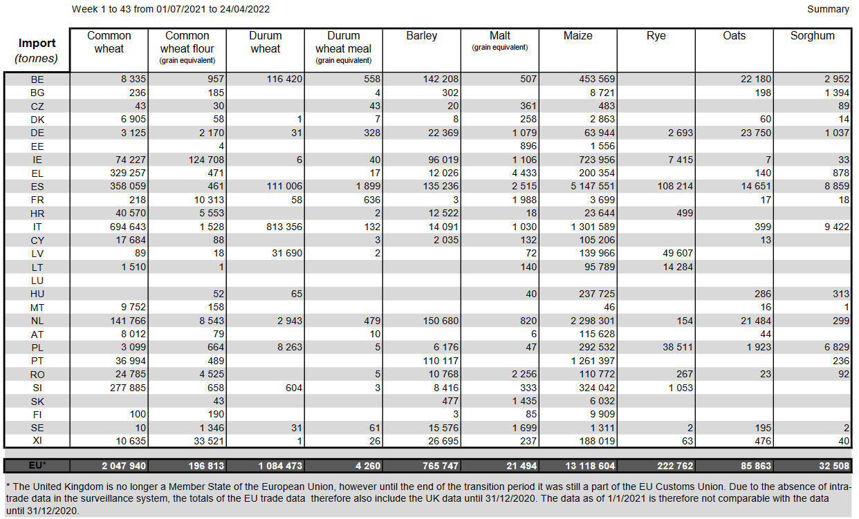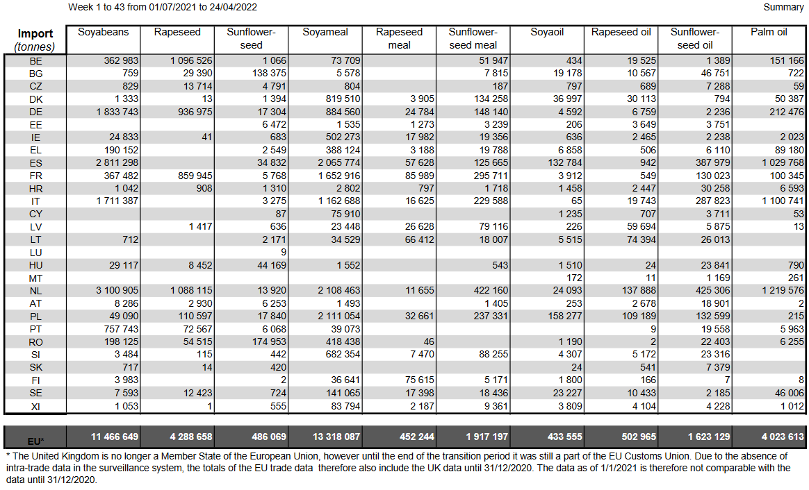 06.04.22 ЕС. Импорт - экспорт зерновых, масличных, растительного масла, шрота. Оперативные данные на 03.04.2022