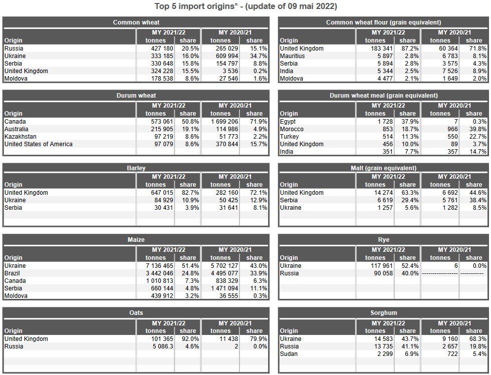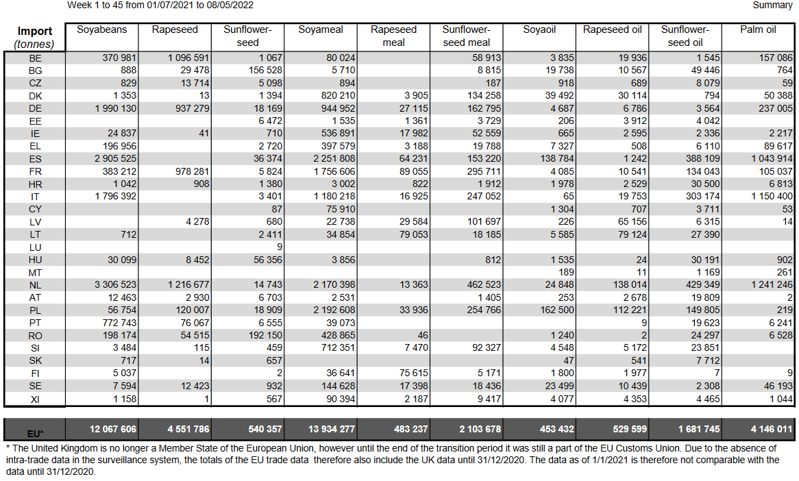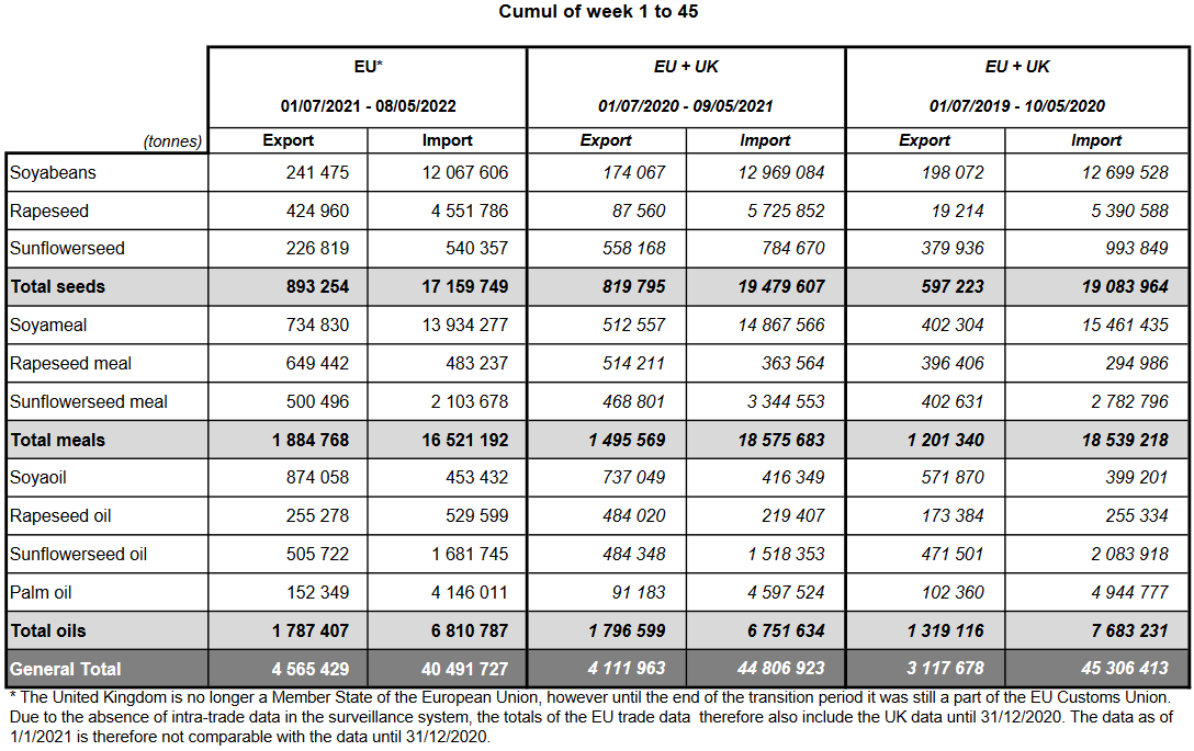 ЕС. Импорт - экспорт зерновых, масличных, растительного масла, шрота. Оперативные данные на 08.05.2022