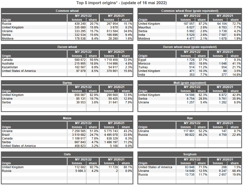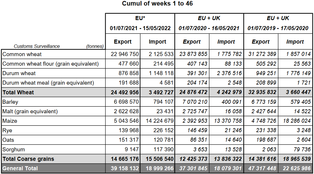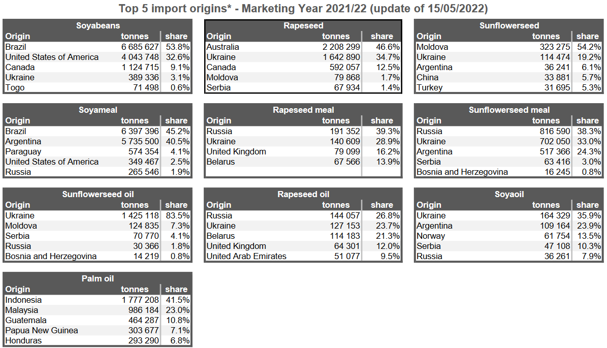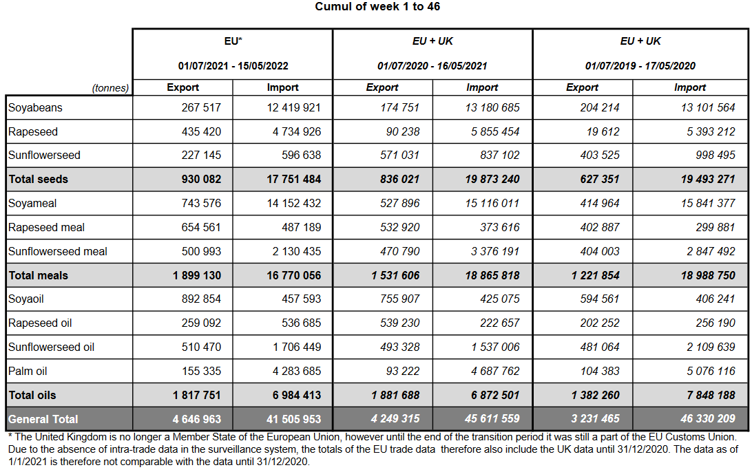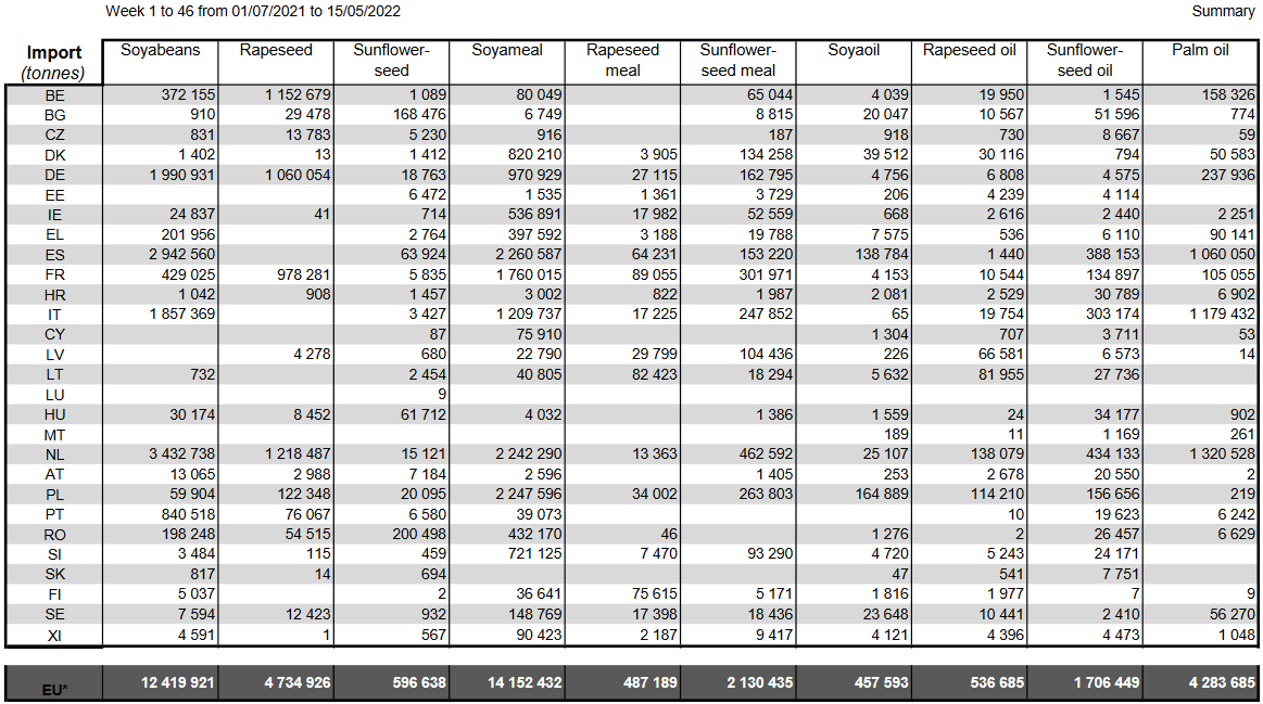12.05.22 ЕС. Импорт - экспорт зерновых, масличных, растительного масла, шрота. Оперативные данные на 08.05.2022