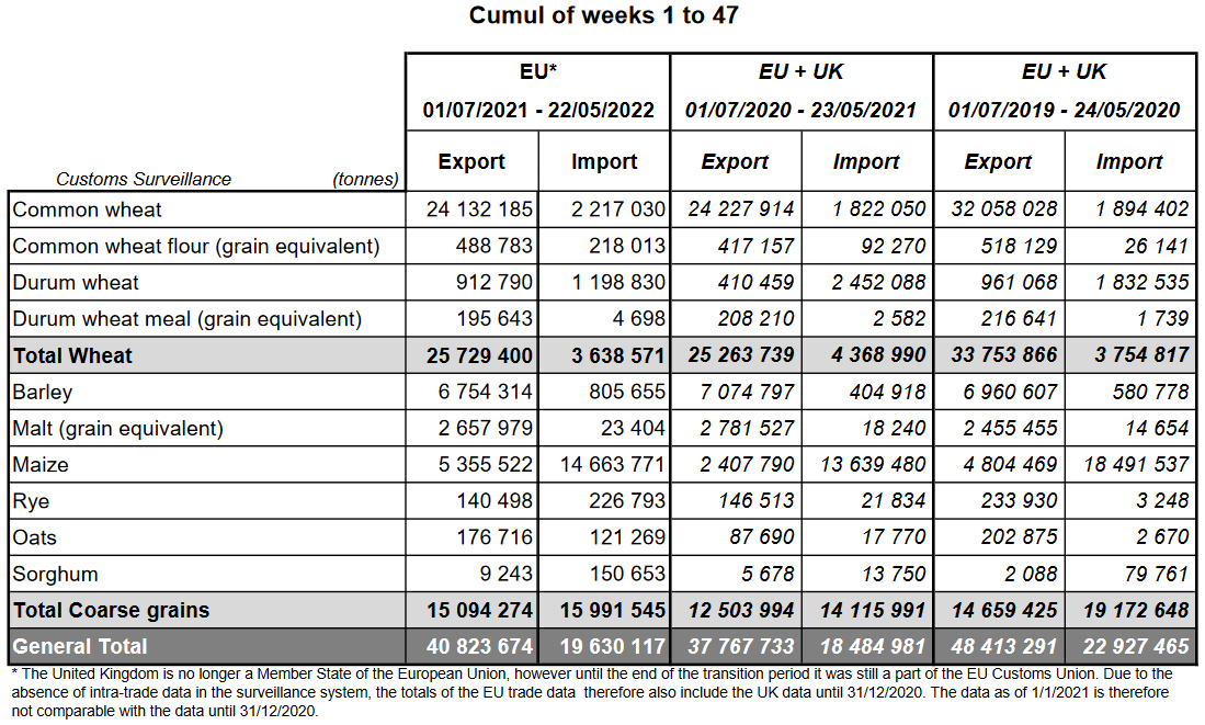 ЕС. Импорт - экспорт зерновых, масличных, растительного масла, шрота. Оперативные данные на 22.05.2022