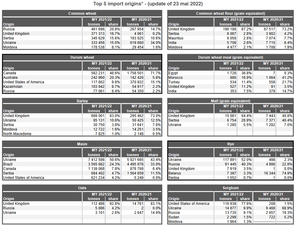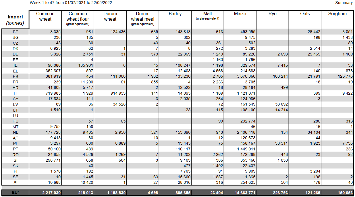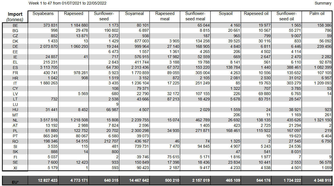 12.05.22 ЕС. Импорт - экспорт зерновых, масличных, растительного масла, шрота. Оперативные данные на 08.05.2022