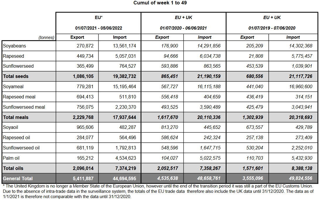 ЕС. Импорт - экспорт зерновых, масличных, растительного масла, шрота. Оперативные данные на 05.06.2022