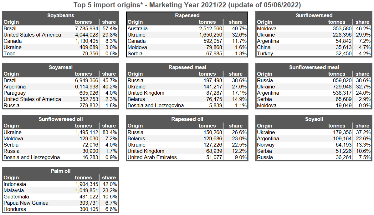 25.05.22 ЕС. Импорт - экспорт зерновых, масличных, растительного масла, шрота. Оперативные данные на 22.05.2022