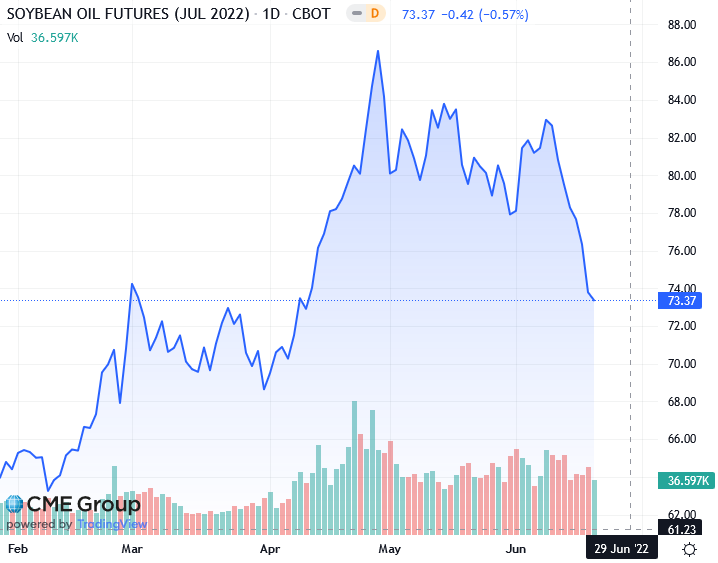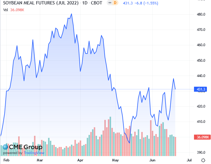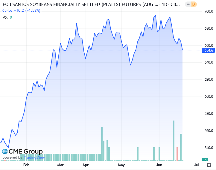 Еженедельные экспортные проверки сои составили 427 344 тонны, сообщает USDA. Это соответствовало торговым прогнозам, которые варьировались от 300 000 до 625 000. Июльский фьючерсный контракт CBOT на сою упал на 21 цент до 16,81 доллара за бушель. Контракт достиг дна на уровне 16,75-3/4 доллара за бушель, самого низкого уровня с 1 июня. Июльские соевые бобы упали ниже своих 30-40-50-дневных скользящих средних в течение сессии. Соевый шрот на CBOT в июле подешевел на 6,80 доллара до 431,30 доллара за тонну, а соевое масло с поставкой в июле упала на 0,42 цента до 73,37 цента за фунт. Июльский соевый шрот не торговался выше своей 100-дневной скользящей средней с 3 мая сообщает oilworld.ru со ссылкой на Рейтер