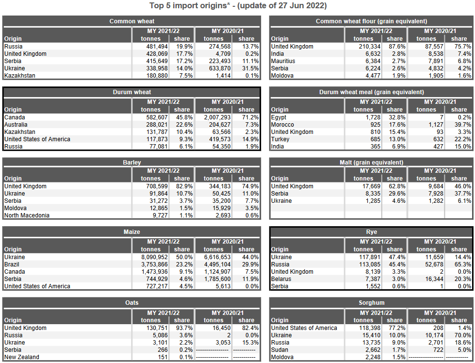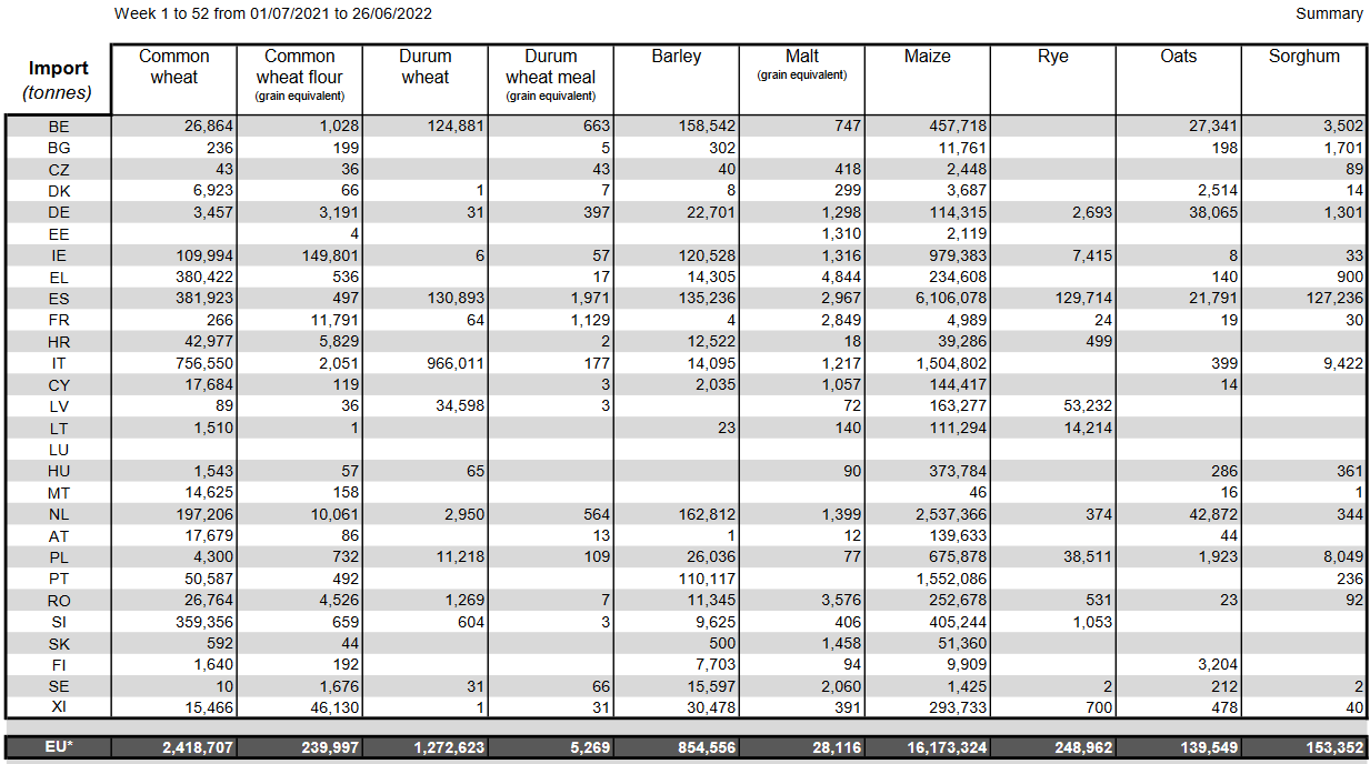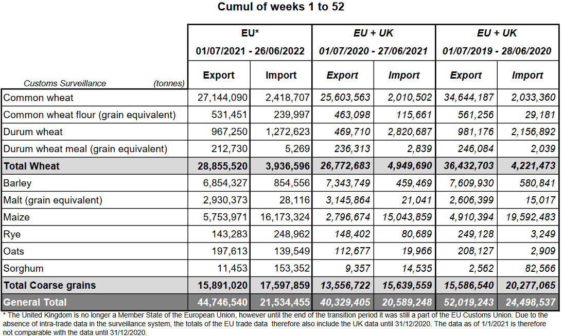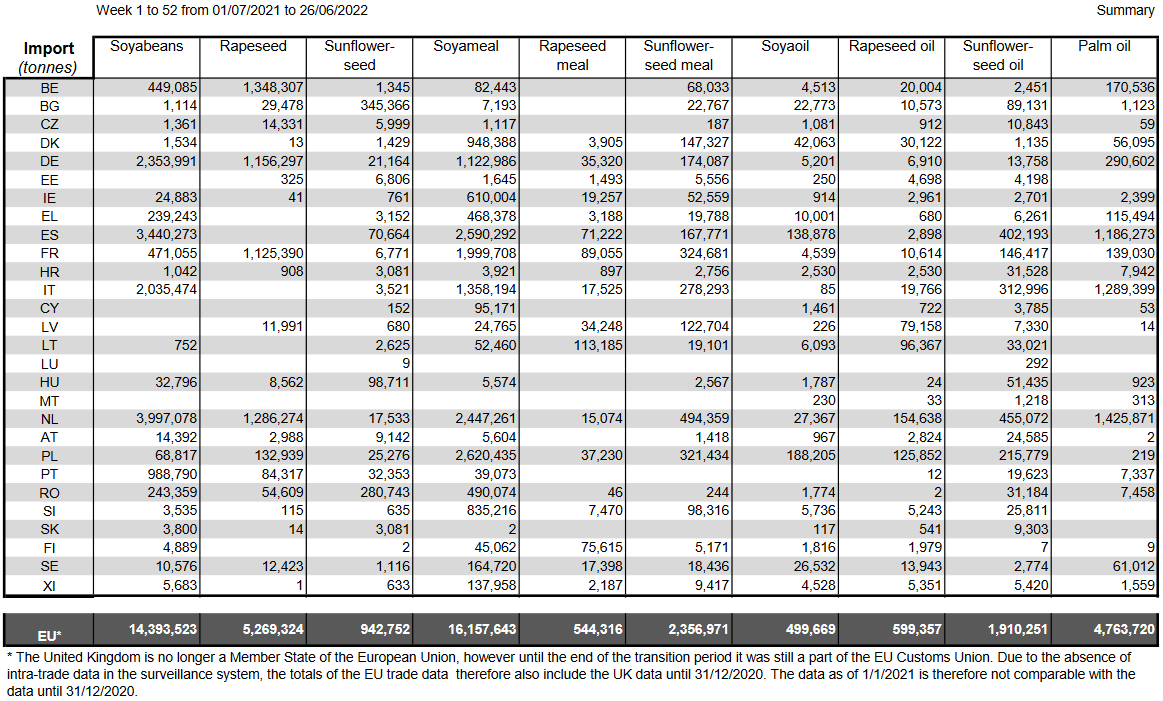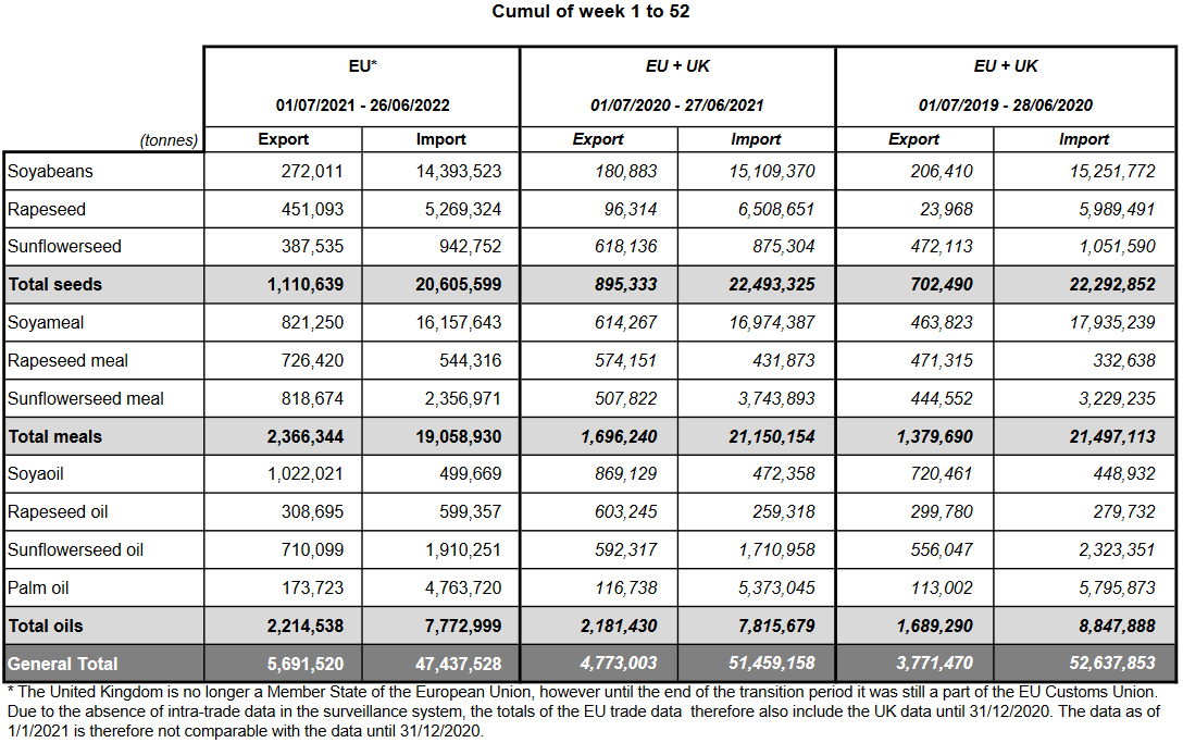 22.06.22 ЕС. Импорт - экспорт зерновых, масличных, растительного масла, шрота. Оперативные данные на 19.06.2022