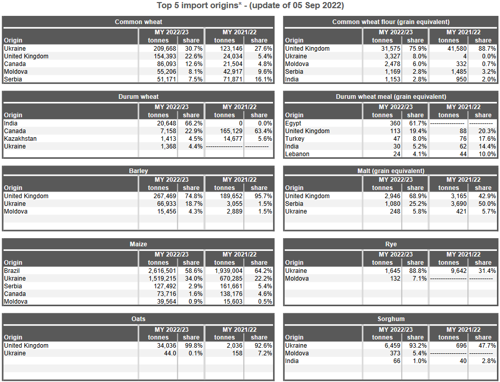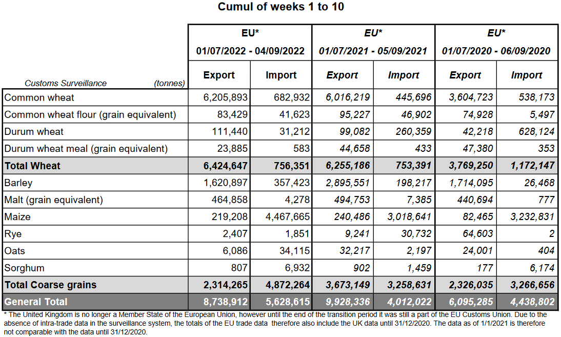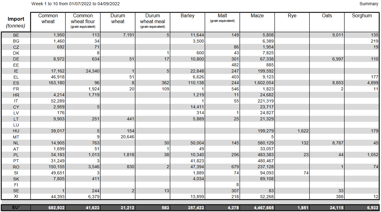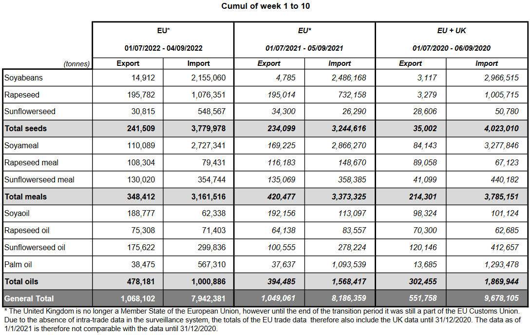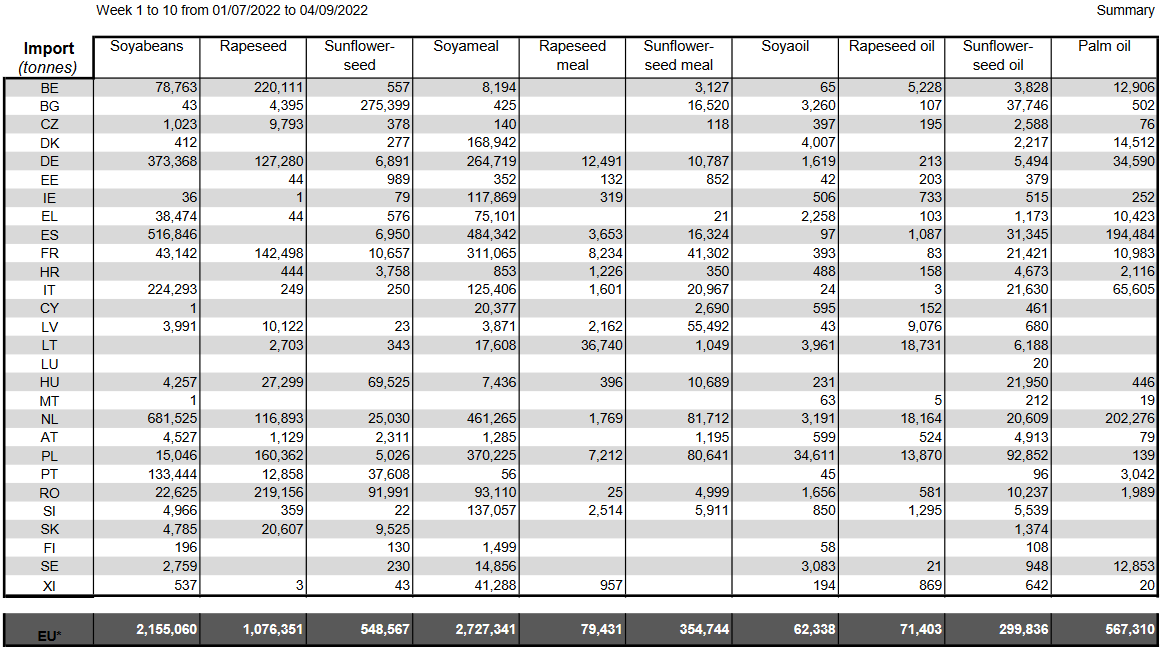 ЕС. Импорт - экспорт зерновых, масличных, растительного масла, шрота. Оперативные данные на 04.09.2022
