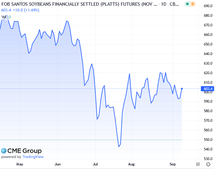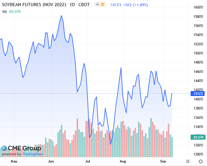Ноябрьские соевые бобы выросли на 26-1/4 цента до 14,12-1/4 доллара за бушель после падения до месячного минимума на предыдущей сессии. Но контракт упал вторую неделю подряд, потеряв 0,6%.